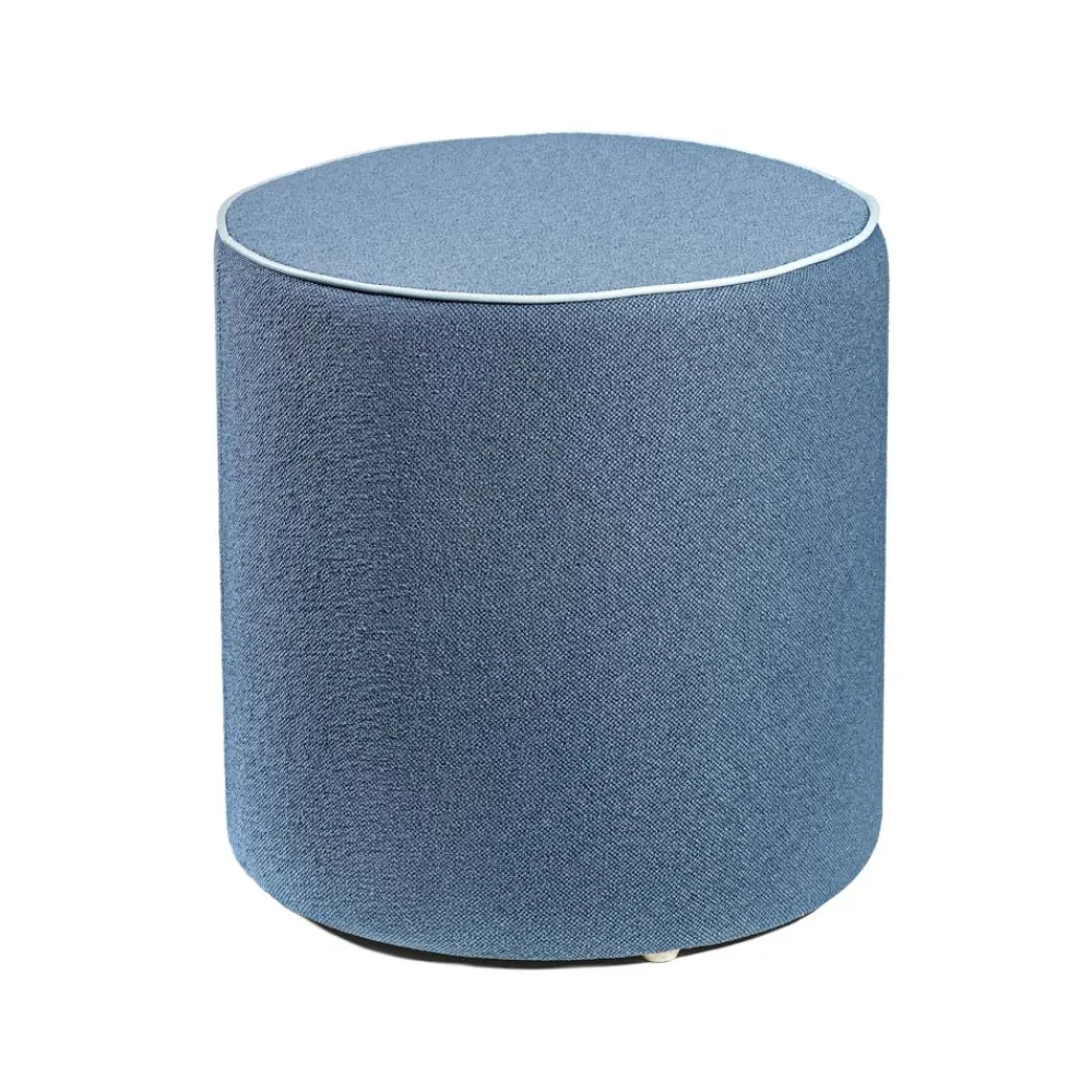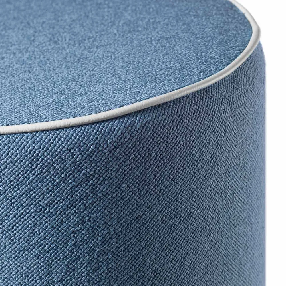 Runder Pouf, gepolstert mit hochdichtem Schaumgummi, vollständig mit blauem Bouclè-Stoff mit kontrastierenden Paspeln und gummierten Füßen bezogen, vollständig in Italien hergestellt.
