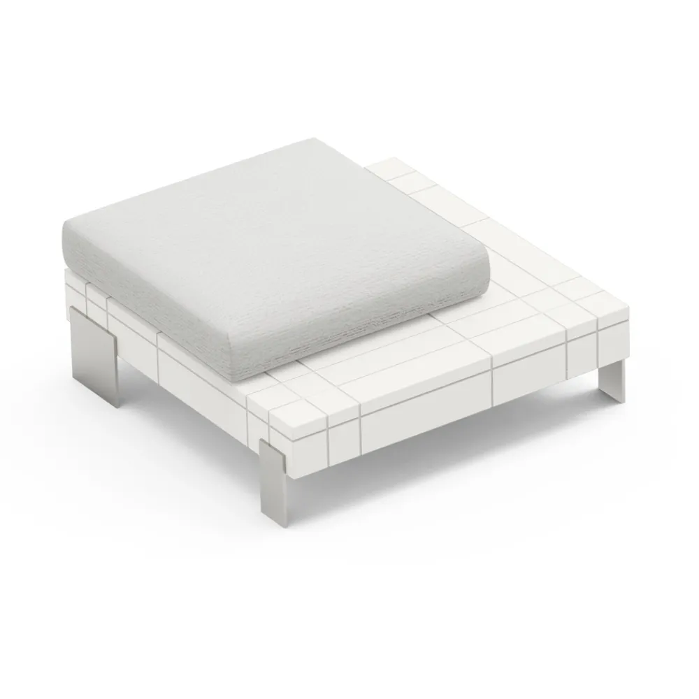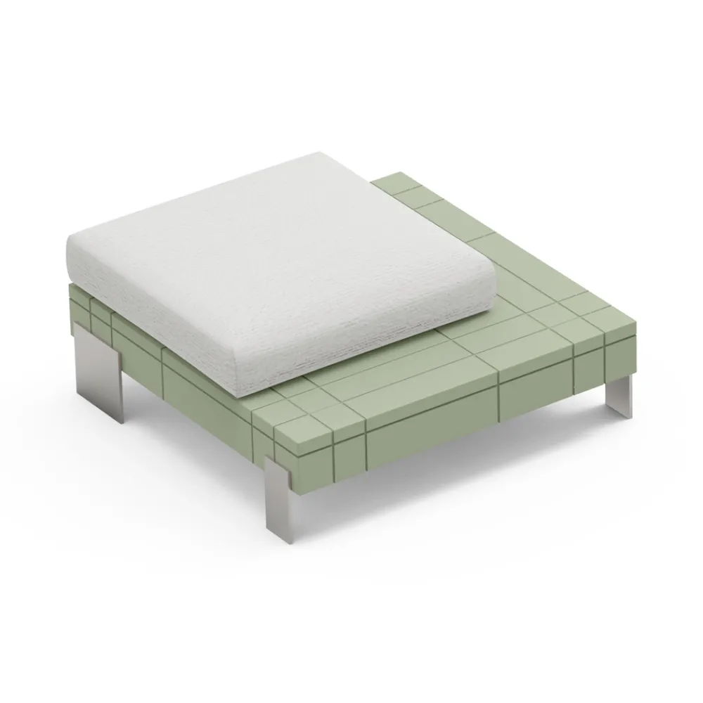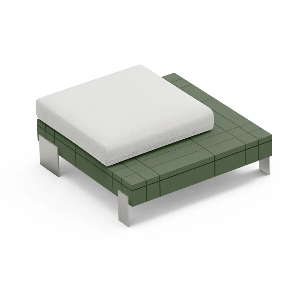 Pouf mit Polyethylenstruktur und Kissen aus Sunbrella-Stoff und Metallfüßen.