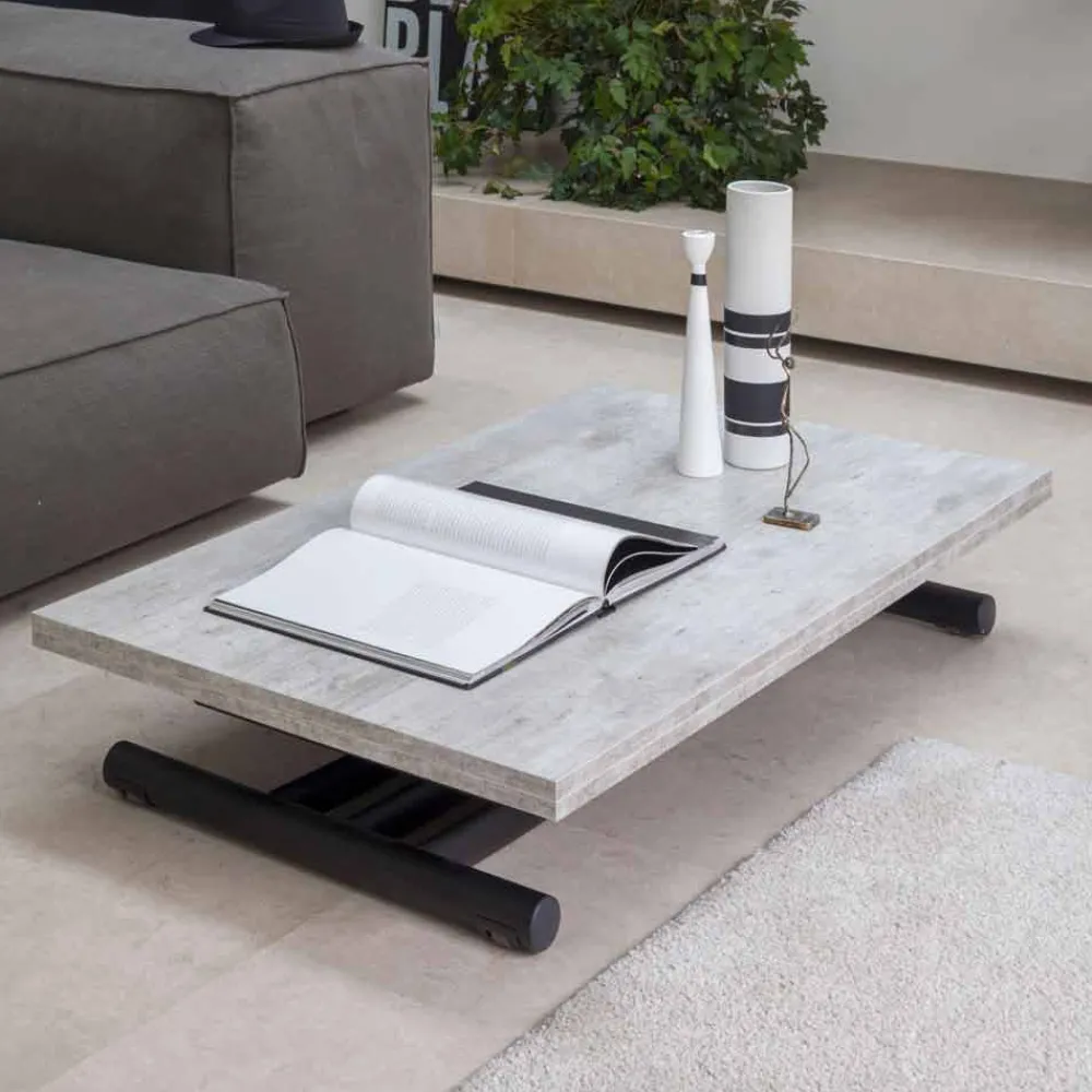 Der in einen Esstisch umwandelbare Couchtisch zeichnet sich durch die Möglichkeit aus, seine Höhe dank eines Gasmechanismus von 22 cm bis 77 cm zu verstellen. Es verfügt außerdem über ein doppelt faltbares Verdeck und einziehbare Räder.