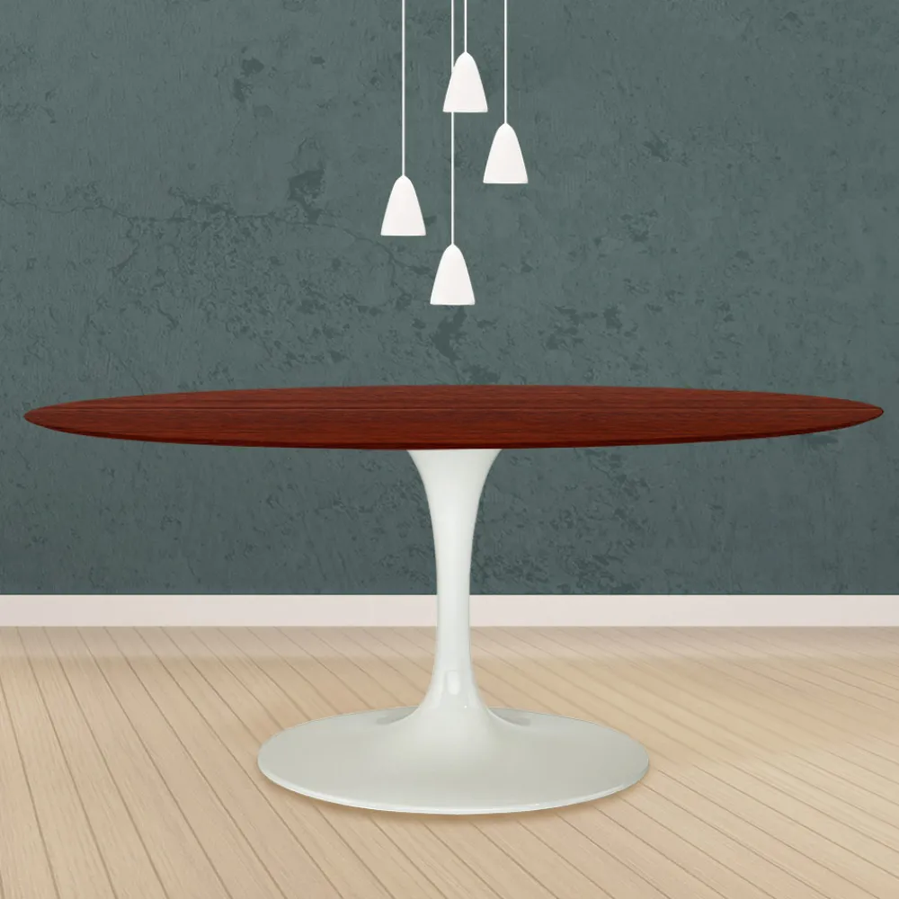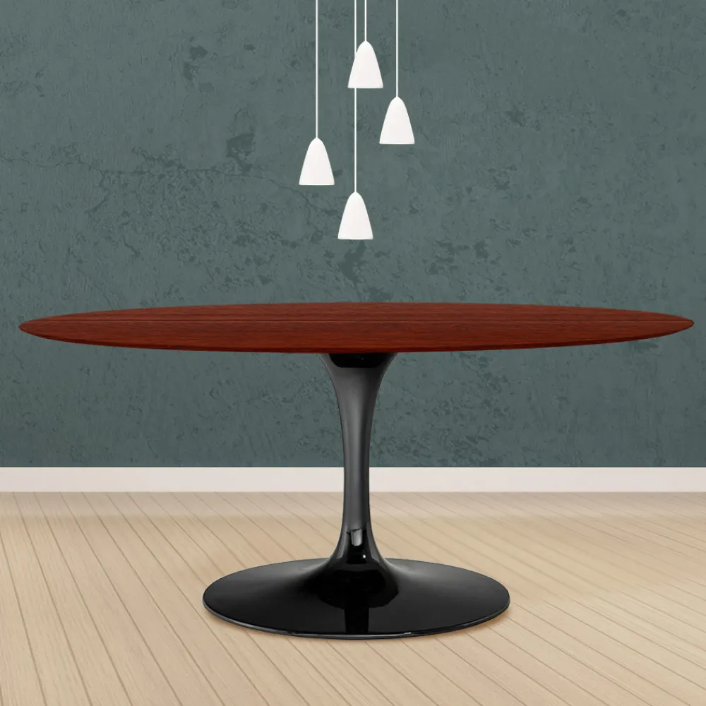 Ovaler Esstisch aus rosenholzgebeizter Eiche und poliertem Aluminiumsockel Made in Italy