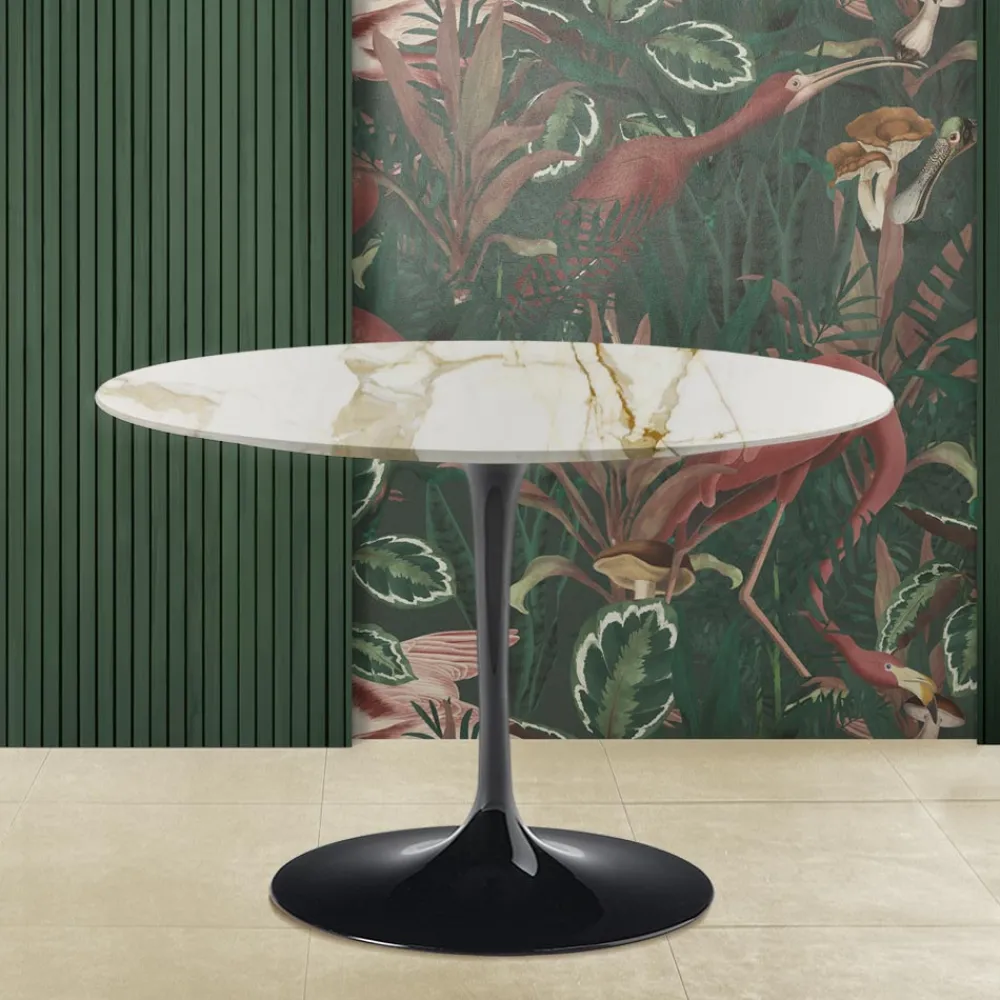 Esstisch mit runder Platte aus goldenem Calacatta-Marmor und poliertem Aluminiumfuß Made in Italy. Dieses Möbelstück ist dank seiner schlichten und eleganten Oberflächen perfekt, um sich in jeden Einrichtungsstil und jedes Esszimmer einzufügen. Goldener Calacatta-Marmor ist einer der wertvollsten Marmore und garantiert Qualität und Raffinesse für ein Produkt, das somit für alle Gelegenheiten und Anlässe verwendet werden kann. Praktikabilität und Funktionalität sind die Hauptmerkmale, die mit der Raffinesse und Geradlinigkeit kombiniert werden, die dieses Möbelstück einzigartig in seiner Art machen.