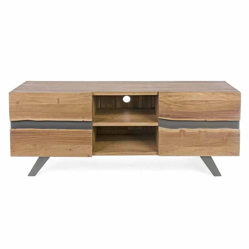 TV-Schrank mit Mango-Holz-Struktur und Metalleinsätzen.