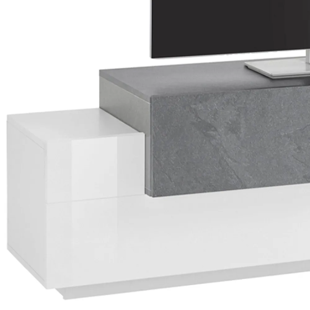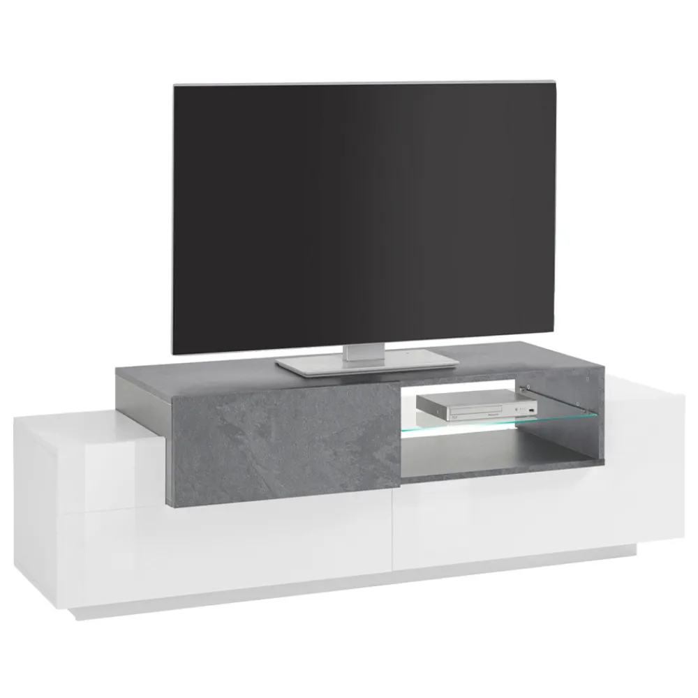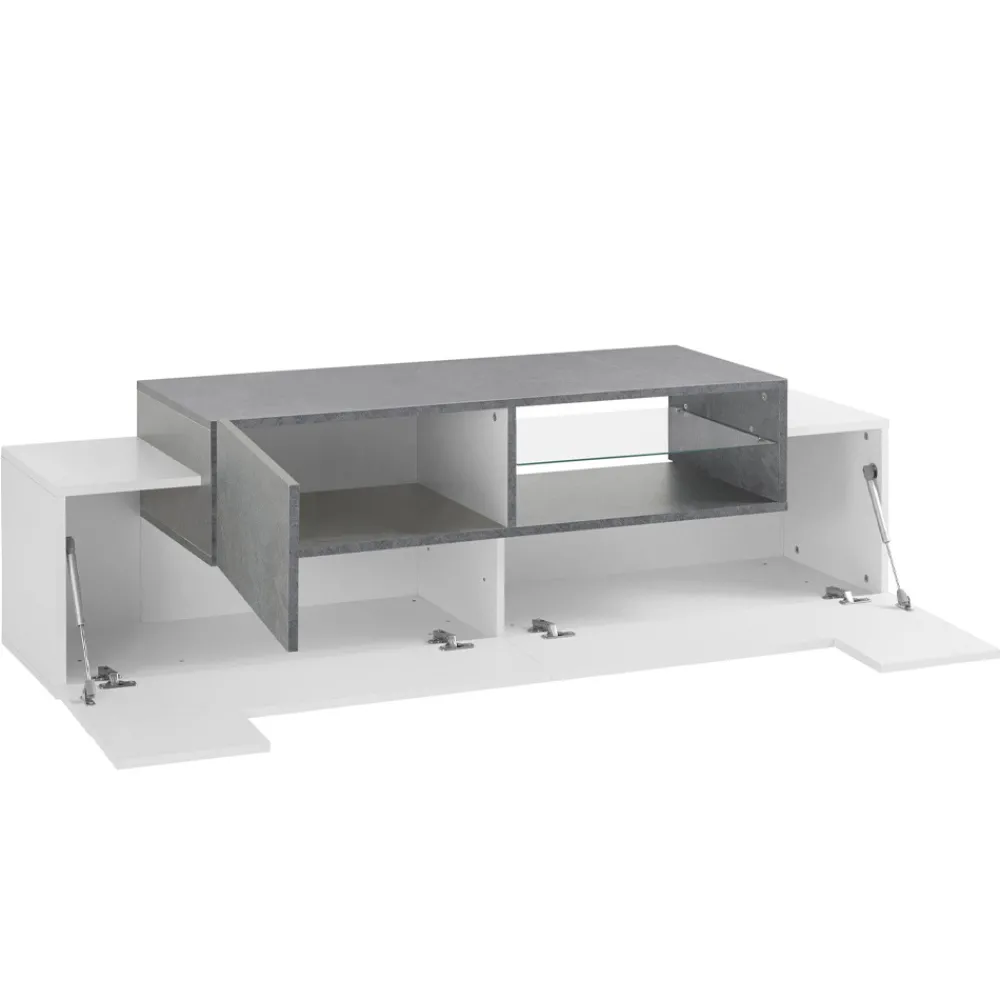 Der niedrige TV-Schrank für das Wohnzimmer besteht aus 2 seitlichen Klapptüren aus weiß glänzend lackiertem Holz und 1 Flügeltür aus Melaminholz, erhältlich in zwei Ausführungen mit einem zentralen offenen Fach mit Glaseinlegeboden. Das so entstandene Design stellt einen suggestiven und zeitgemäßen Kontrast für den Wohnbereich dar.