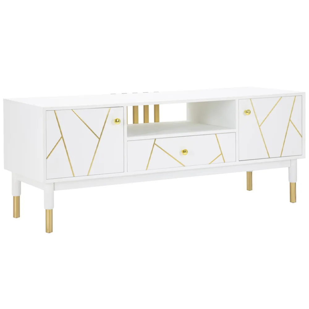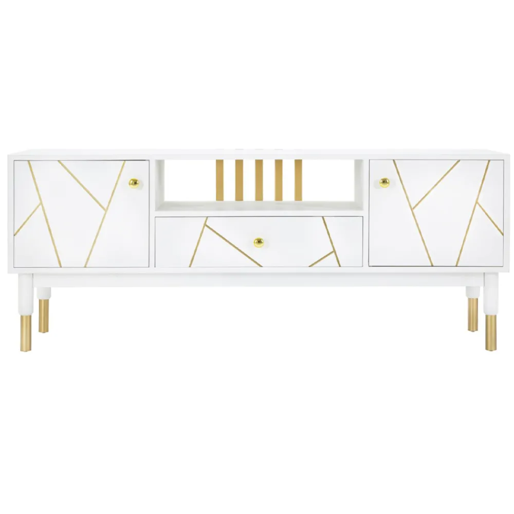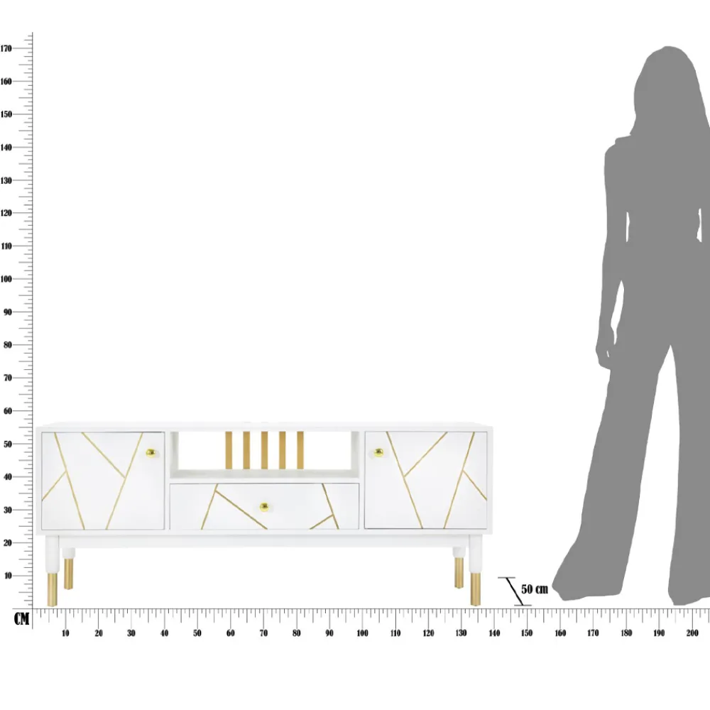 TV-Schrank mit weißer MDF-Struktur, bereichert mit goldenen Verzierungen.