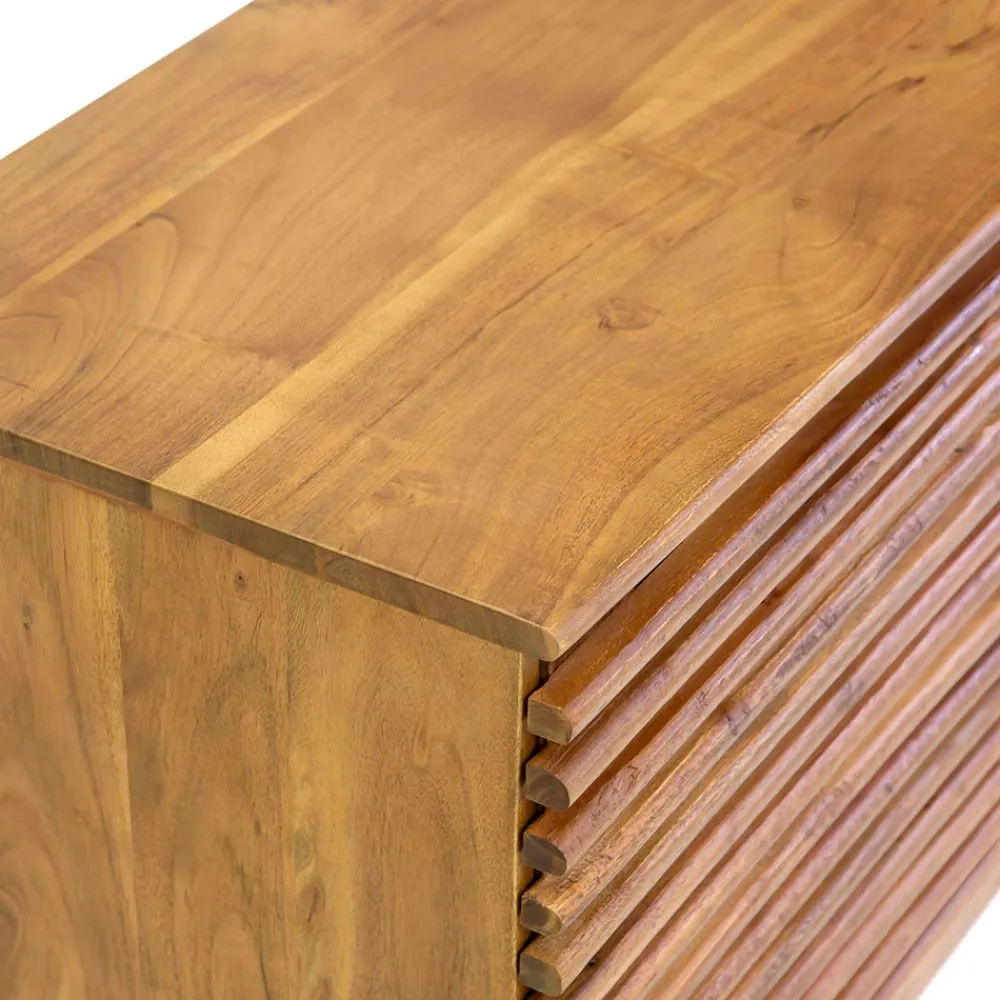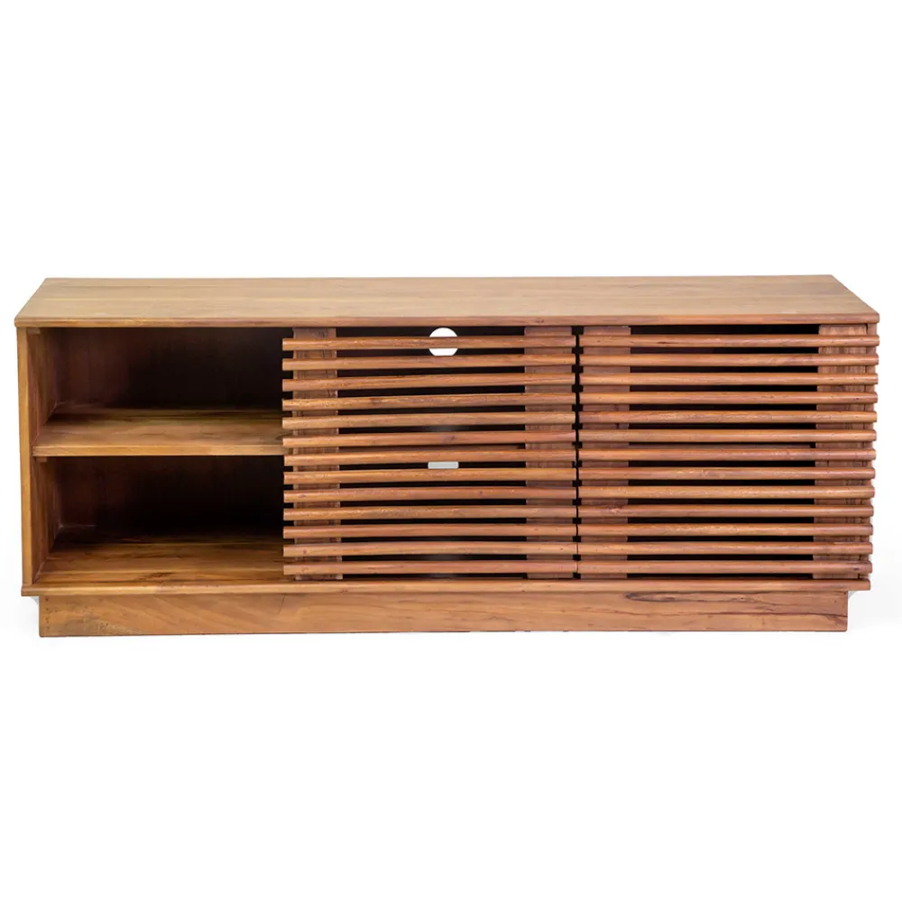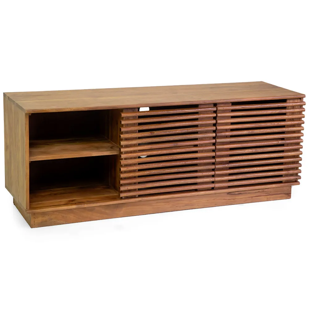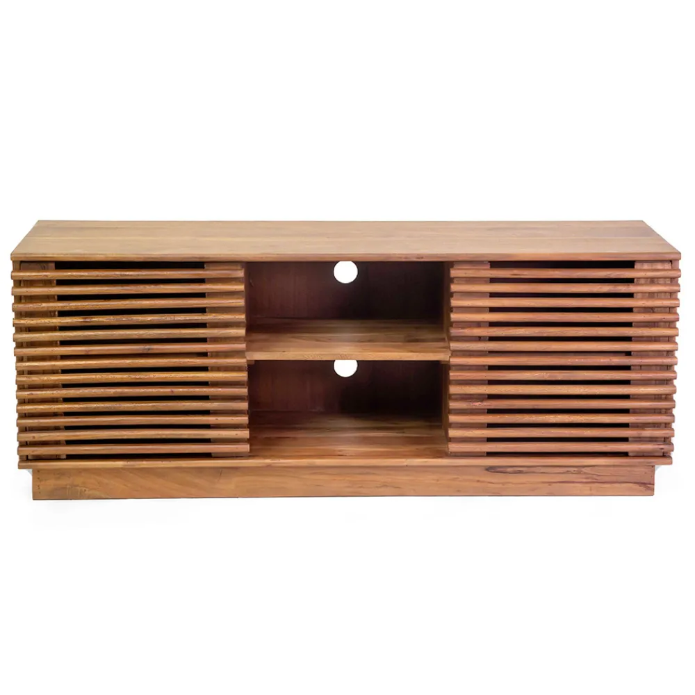 Verleihen Sie Ihrem Wohnzimmer einen Hauch natürlicher Eleganz mit diesem atemberaubenden TV-Ständer aus Akazienholz. Sorgfältig handgefertigt, zeichnet sich das Design durch moderne Linien und einzigartige Details wie die Lattentüren aus, die Ihrem Raum Tiefe und Stil verleihen.