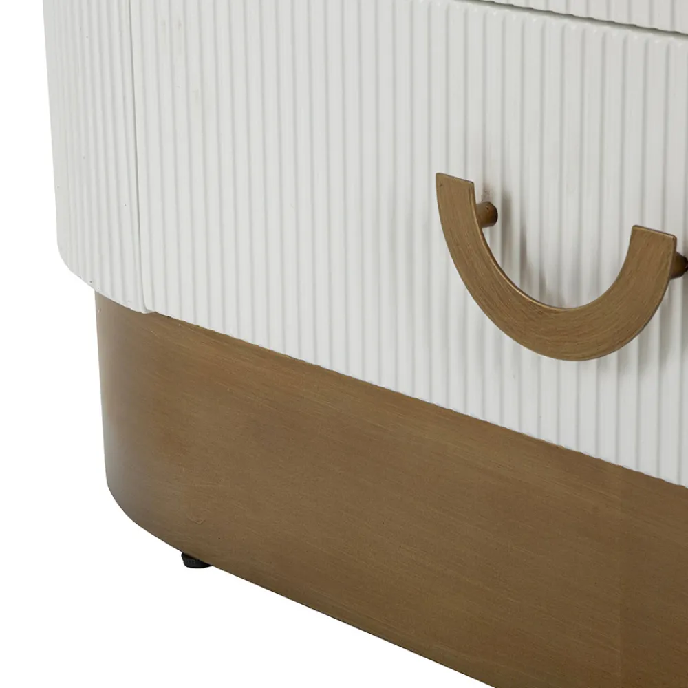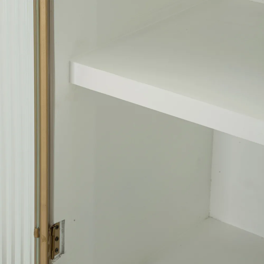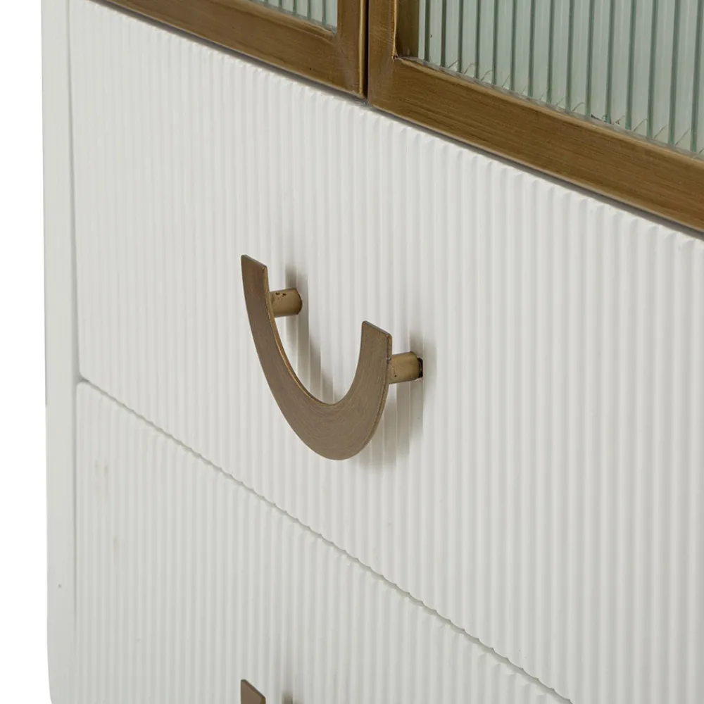 Das weiße Finish mit vertikalen Rillendetails verleiht einen Hauch von optischer Struktur und Tiefe , während die Linien des Sockels und der Griffe einen warmen Kontrast erzeugen, der das Möbelstück noch mehr aufwertet. Seine abgerundeten Formen verleihen Räumen eine einzigartige Weichheit und bieten gleichzeitig großzügigen Stauraum, der mit internen Regalen und geräumigen Schubladen praktisch organisiert ist.