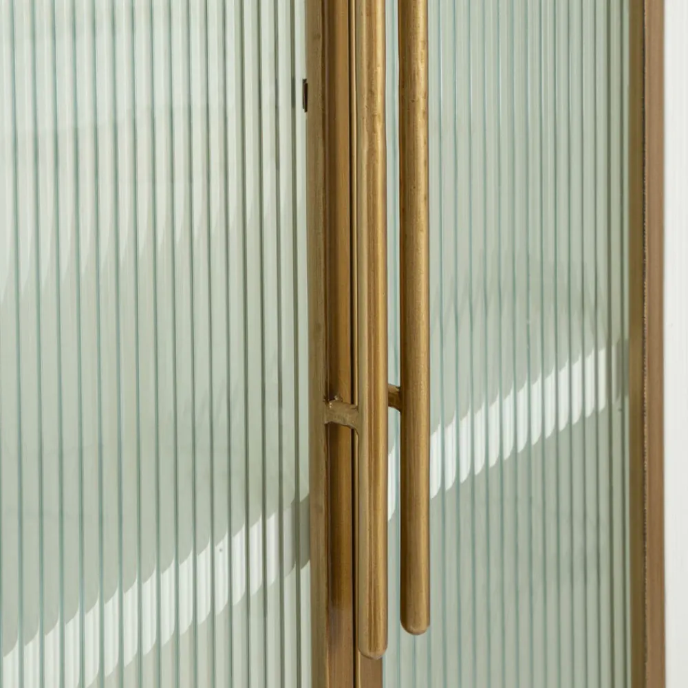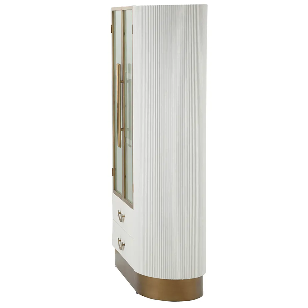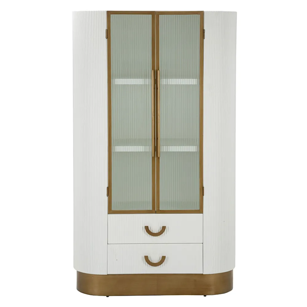 Diese Vitrine ist ein raffiniertes Design-Meisterwerk, das zeitgenössische Eleganz und Vielseitigkeit vereint . Die geschwungene Silhouette ist mit Glastüren verziert, die einen Blick auf das Innere bieten und sich perfekt für die Präsentation Ihrer Glaswaren oder Wertgegenstände eignen, jedoch mit einer Diskretion, die Ordnung und Raffinesse bewahrt.