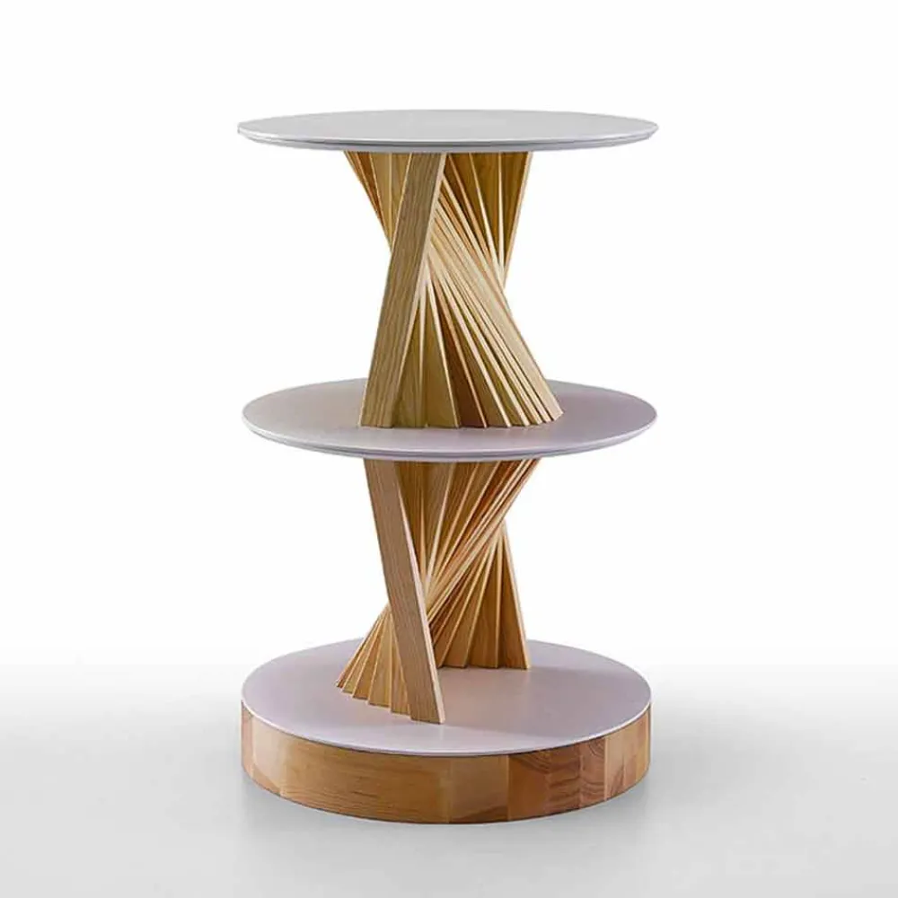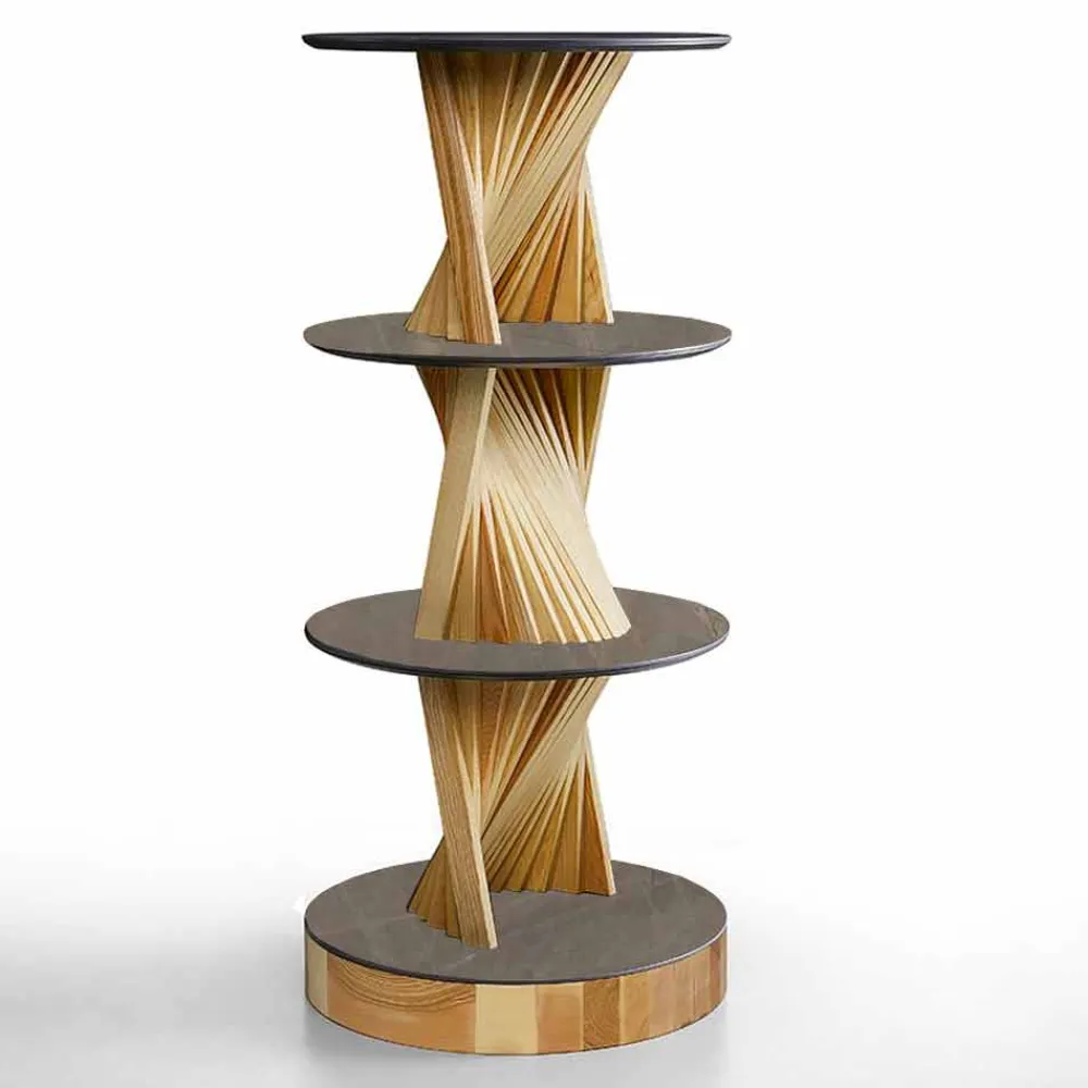 Moderne Möbel aus Italien mit Struktur aus handgeölten Eschenholzstreifen in natürlicher Ausführung mit runden Regalen aus glänzendem oder mattem Marmorsteinzeug .