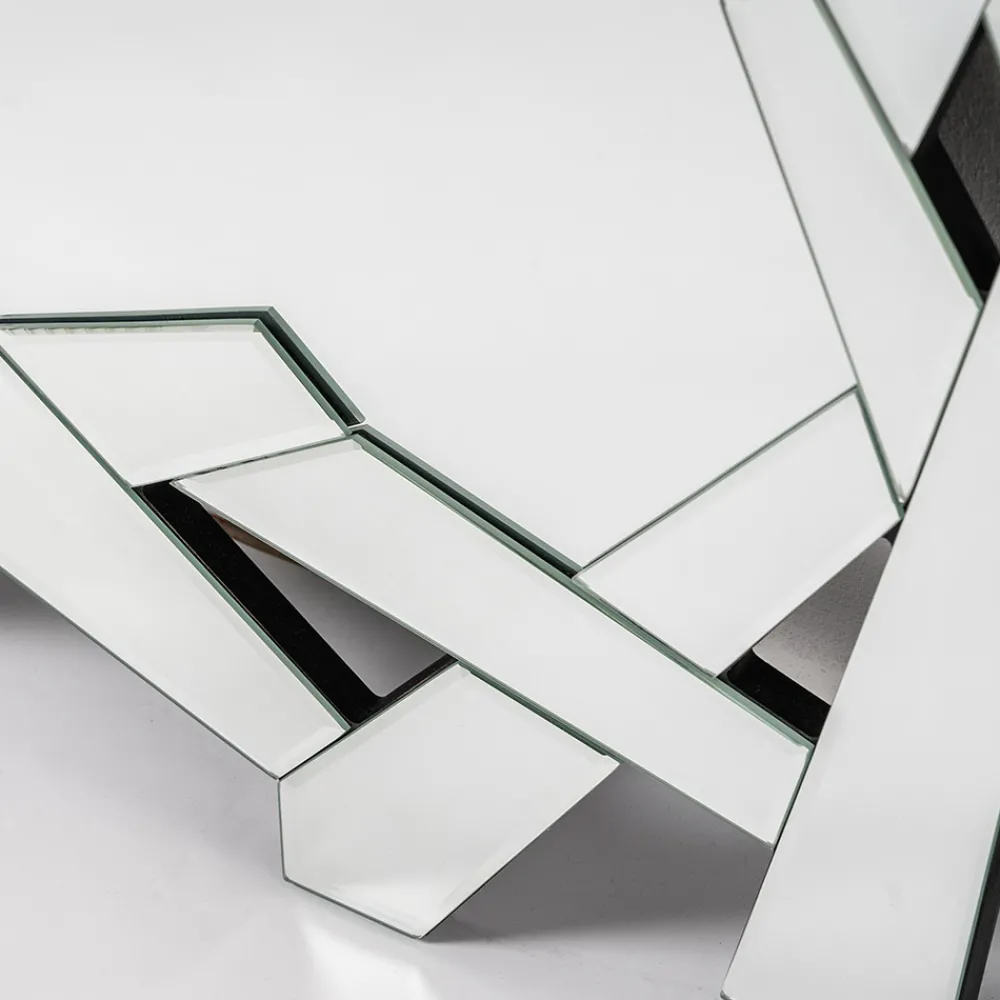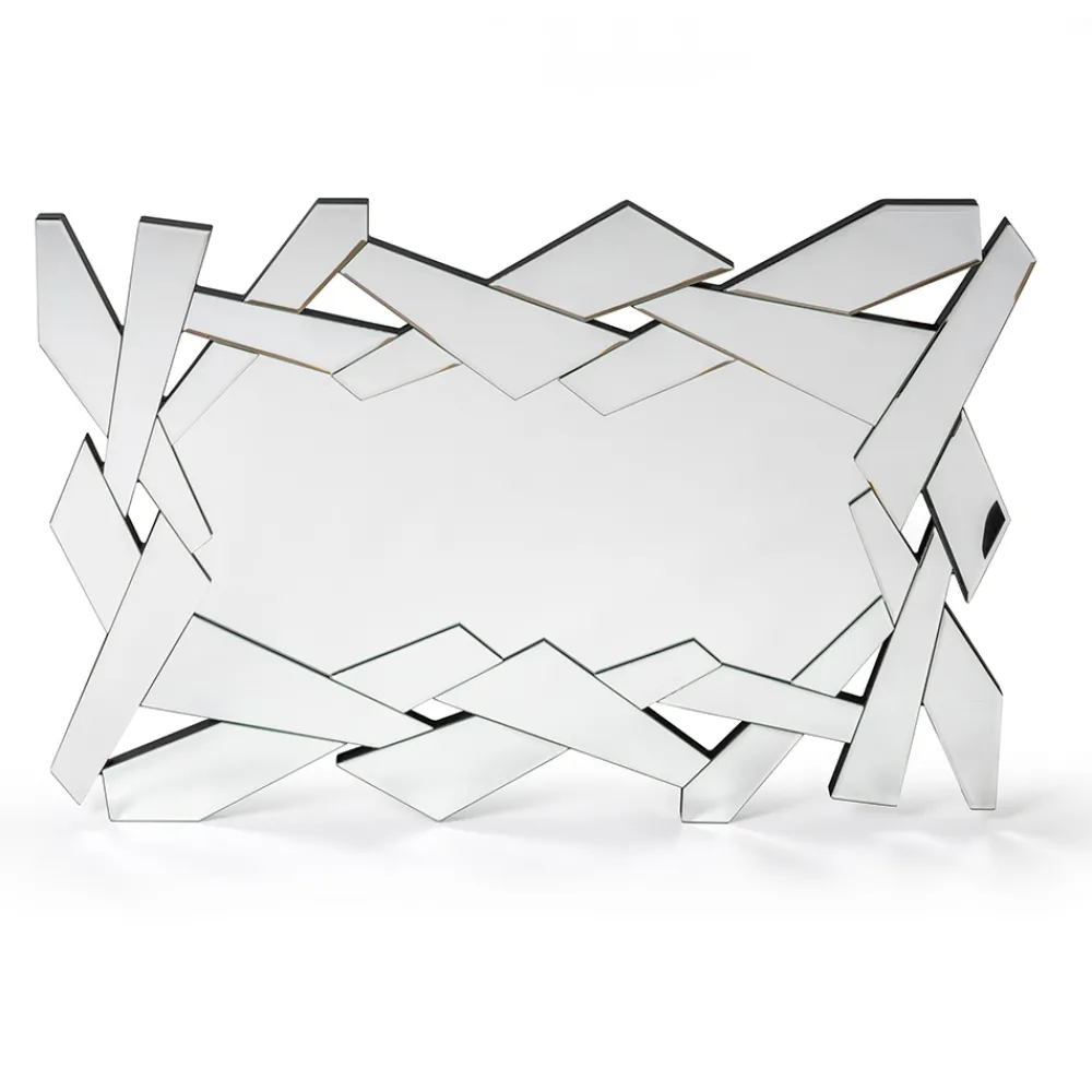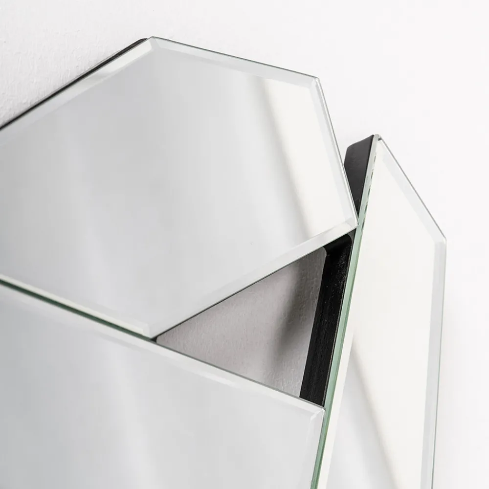 Wandspiegel aus Glas mit geometrisch geformtem Rahmen.