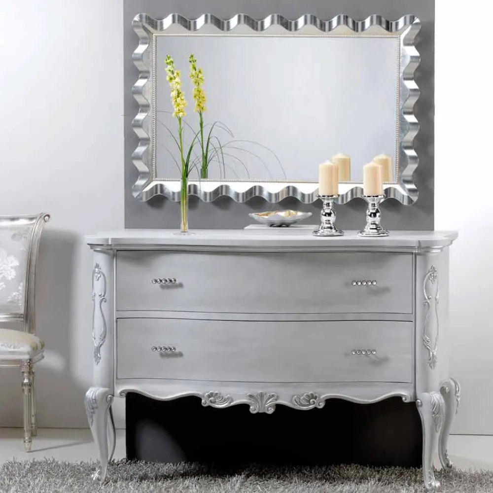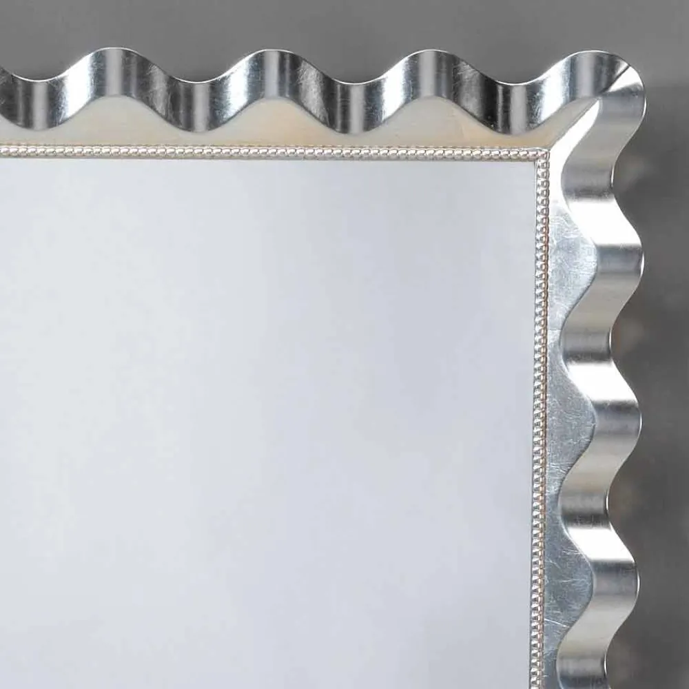 Der Spiegelrahmen besteht aus Holz und wurde mit einen silberbeschichteten wellenförmigen Spiegelrahmen im Glamour Effekt gestaltet. Der Spiegelrand wurde außerdem mit kleinen Details, wie mit Extra Perlen effektvoll gestaltet. Ein hochwertiger Kristallspiegel mit dekorativen Facettenschliff – der Spiegel hat eine Dicke von 4 mm. Made in Italy. Der Spiegel kann sowohl vertikal als auch horizontal aufgehangen werden.