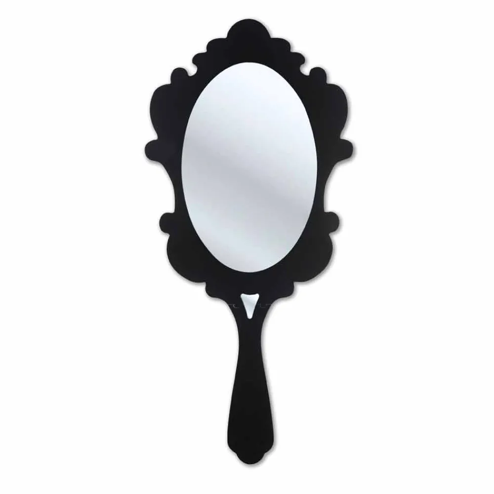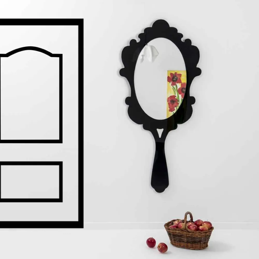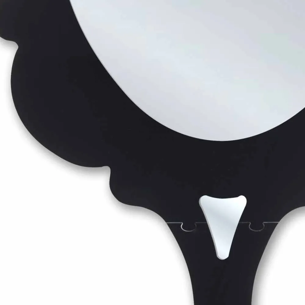Spiegel mit einem wichtigen Rahmen in schwarzem Plexiglas, in PMMA aus 100% reinem Polymer von der feenhaften Silhouette eines kleinen Handtaschenspiegels, aber die Größe eines großen „Spiegels meiner Wünsche“. Das Plexiglas ist stoßfest, unverformbar, unveränderbar und wärmeisolierend, Helligkeit und Helligkeit bleiben konstant und unverändert. PMMA Plexiglas aus reinem Polymer ist ungiftig, hypoallergen, geruchlos und antibakteriell. 100% recycelbar Designed, entworfen und hergestellt in Italien, mit italienischen Materialien.