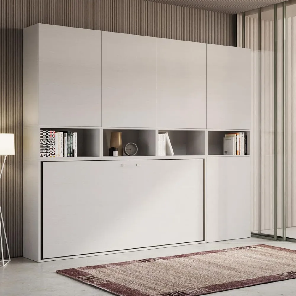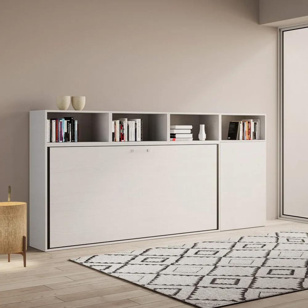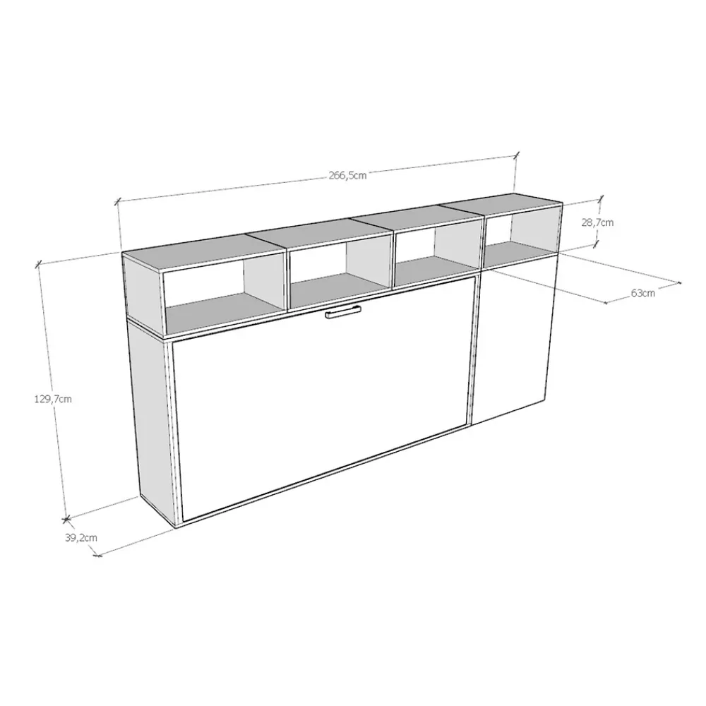 - ZUSAMMENSETZUNG G : Einzelklappbett, das sich in ein Bücherregal/einen Kleiderschrank mit neun Fächern verwandeln lässt (drei mit Tür und Innenregal und sechs offen) – Geschlossenes Bett an der Wand: 266,5 x 39,2 x Höhe 194,4 cm / Offenes Bett: 266,5,9 x 106 x Höhe 194,4 cm