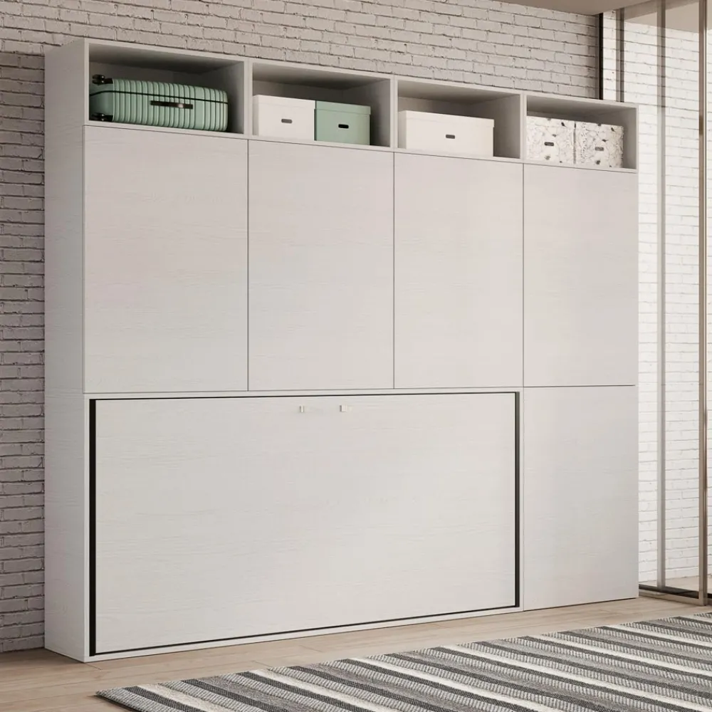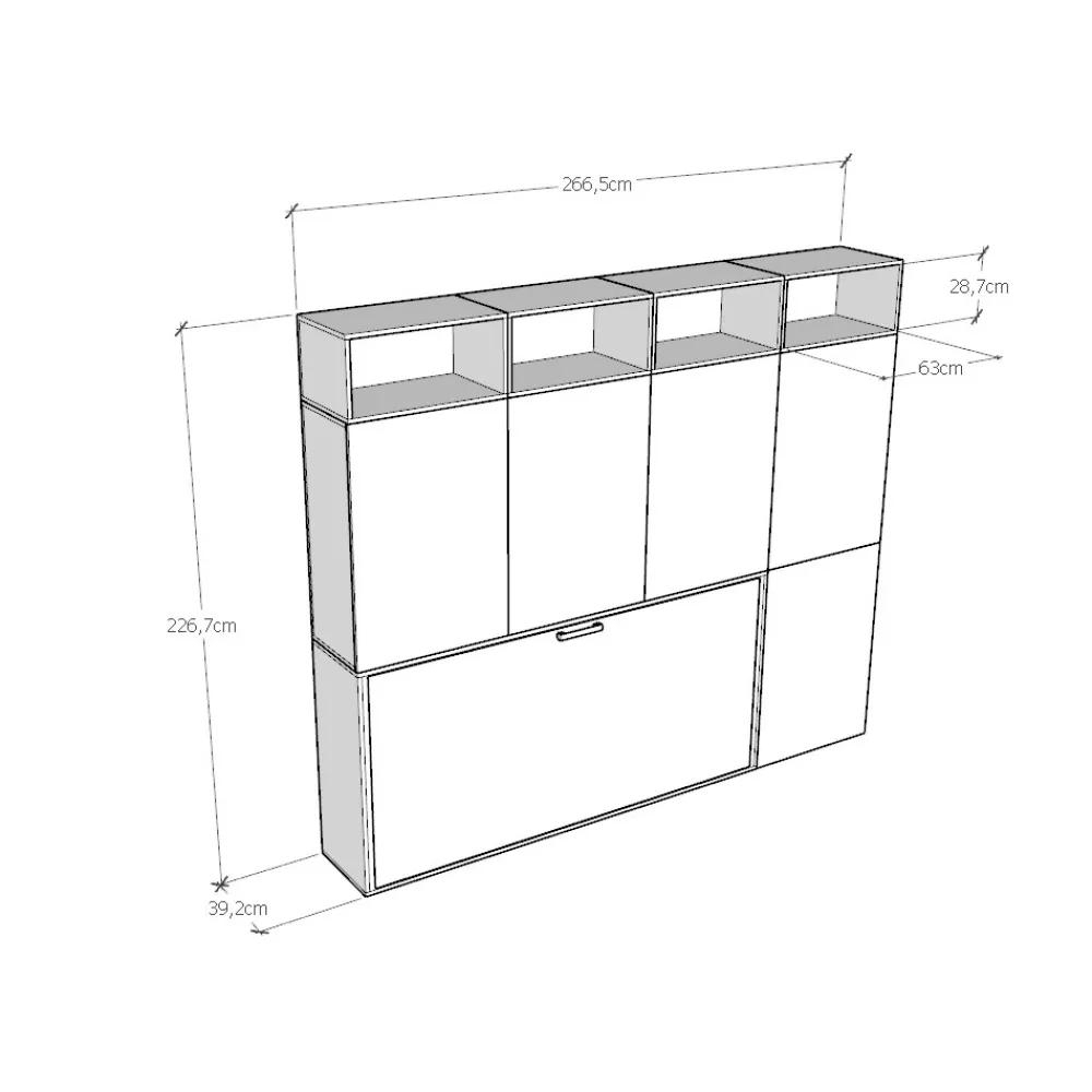 - ZUSAMMENSETZUNG E : Einzelklappbett in einem Bücherregal/Kleiderschrank mit elf Fächern (vier mit Tür und Innenregal und sieben offene Fächer) – Geschlossenes Bett an der Wand: 266,5 x 39,2 x Höhe 226,7 cm / Offenes Bett: 266,5,9 x 106 x Höhe 226,7 cm