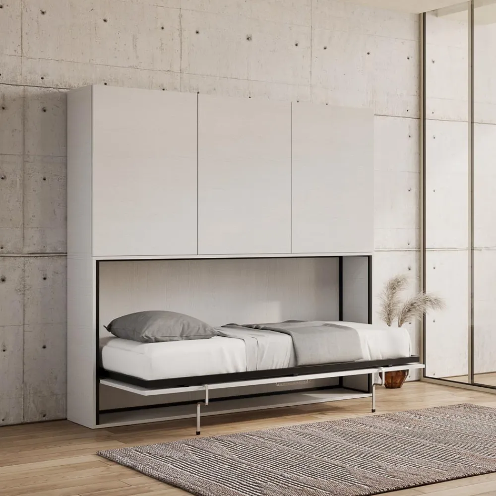 - ZUSAMMENSETZUNG D : Einzelbett, das in einem Kleiderschrank mit drei Fächern (jedes mit einem internen Regal) mit Tür versteckt ist – Bett an der Wand geschlossen: 199,9 x 39,2 x Höhe 194,4 cm / Offenes Bett: 199,9 x 106 x Höhe 194,4 cm