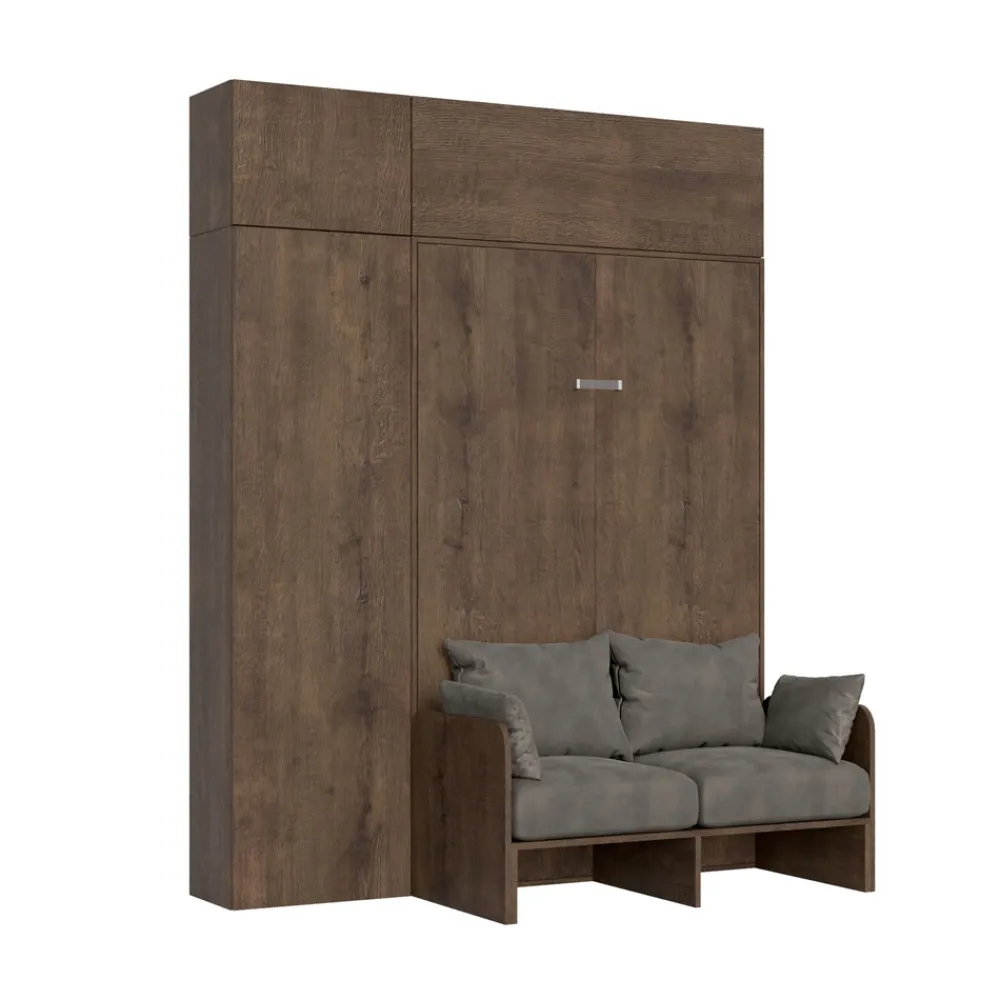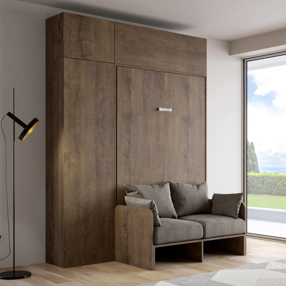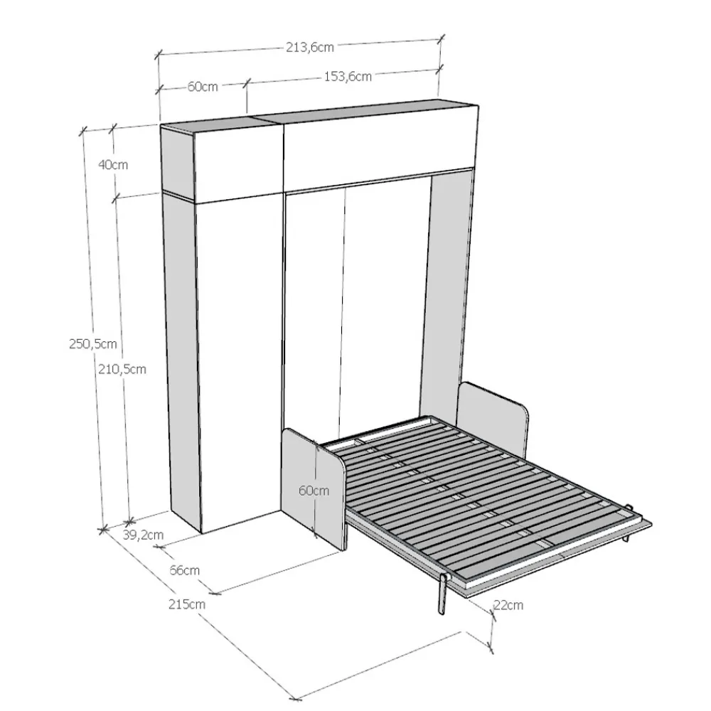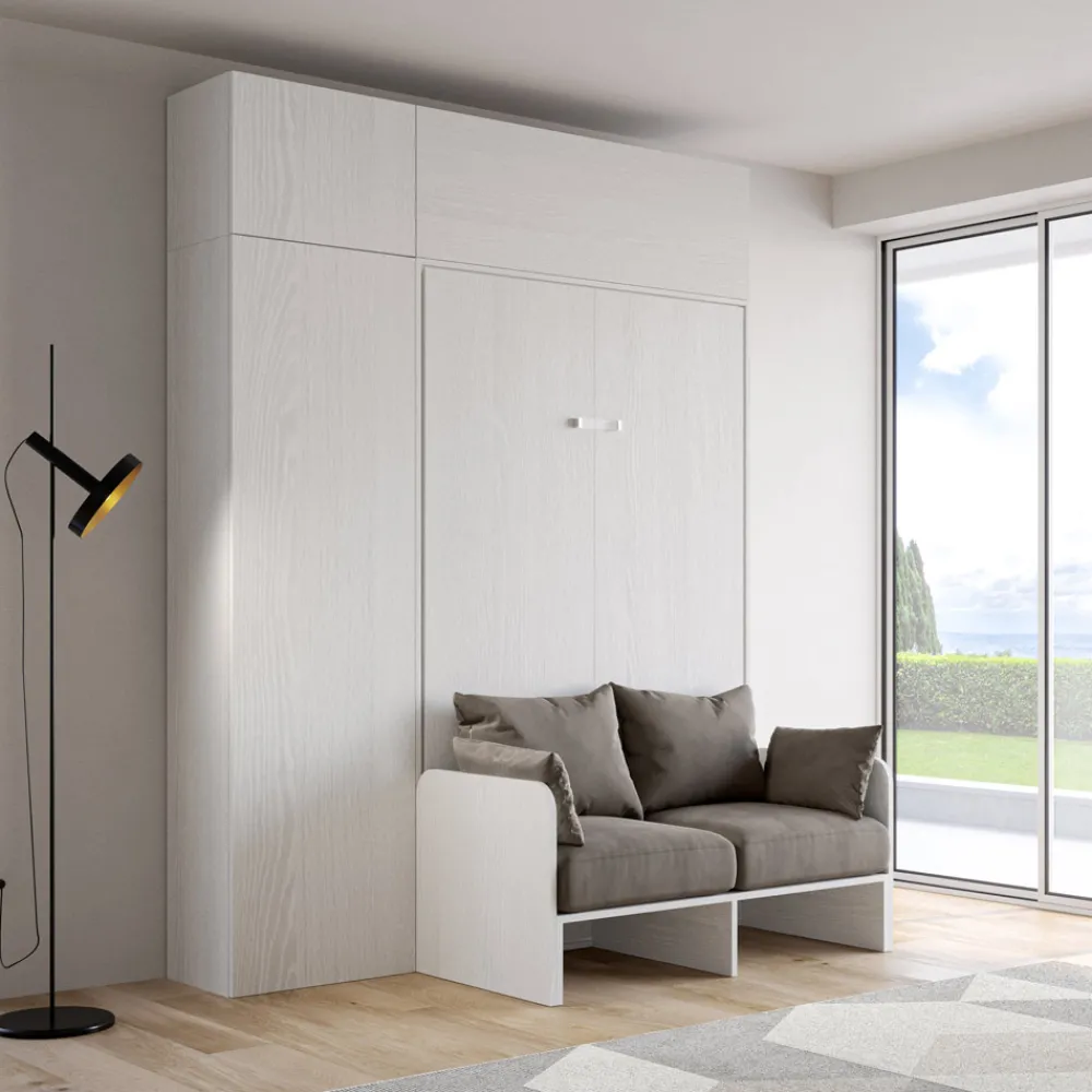 Der Bettrahmen besteht aus 18 mm dicken Melamin-Spanplatten und gewährleistet so Widerstandsfähigkeit und Langlebigkeit. Der Öffnungsmechanismus ist sanft und sicher und verwandelt die Wand mit einer einfachen Geste in ein bequemes Bett.