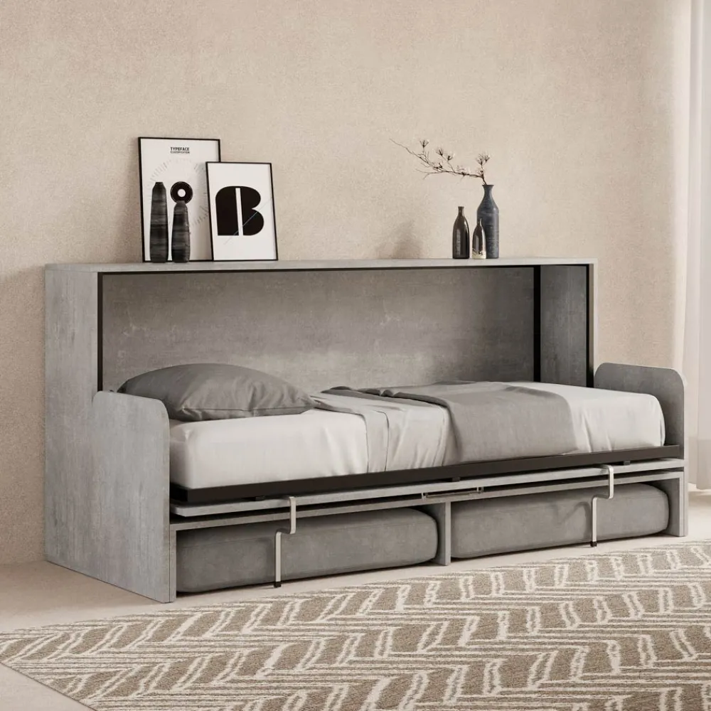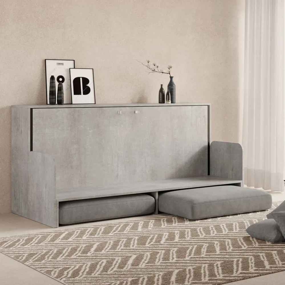 Horizontales Klappbett mit Bett- und Sofastruktur aus 18 mm dicker veredelter Spanplatte, Bettuntergestell aus verstärktem Eisen, lackiert mit Epoxidpulver in geprägter Aluminiumfarbe.