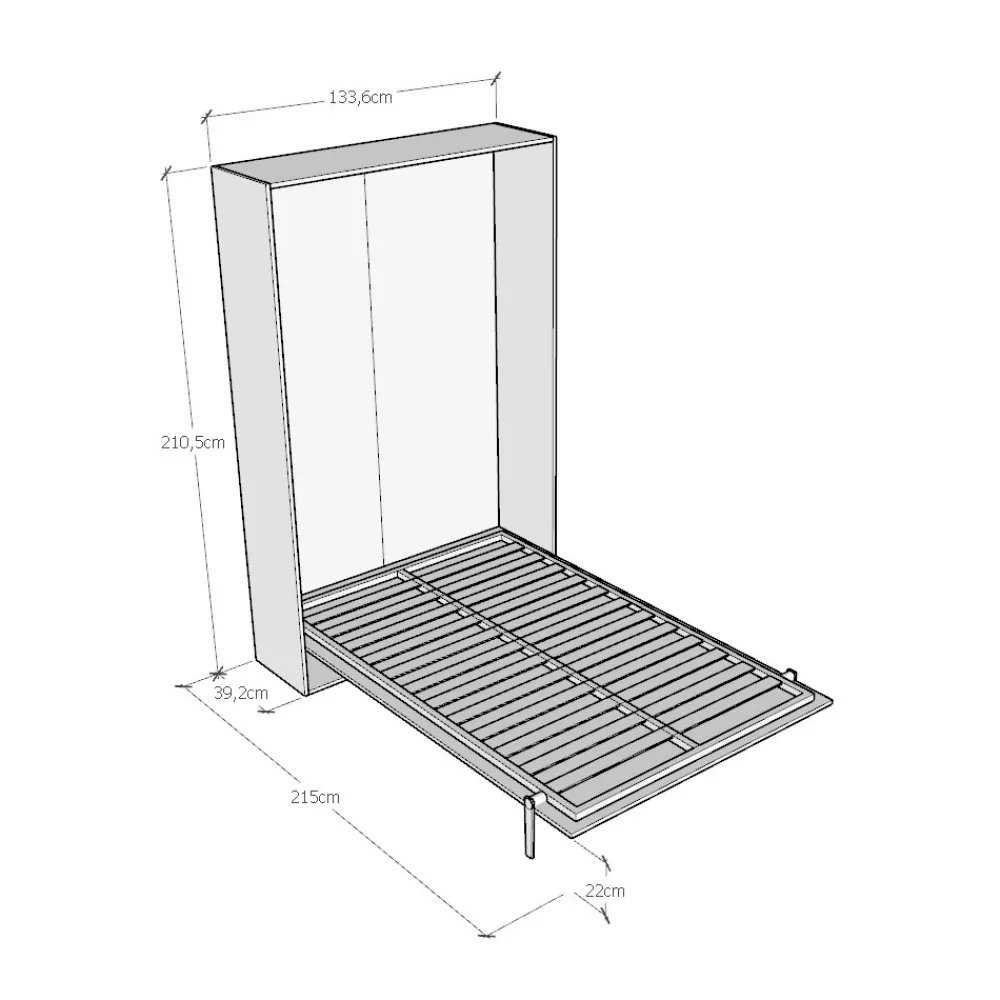 Der Bettrahmen besteht aus 18 mm dicken Melamin-Spanplatten und gewährleistet so Widerstandsfähigkeit und Langlebigkeit. Der Öffnungsmechanismus ist sanft und sicher und verwandelt die Wand mit einer einfachen Geste in ein bequemes Bett.