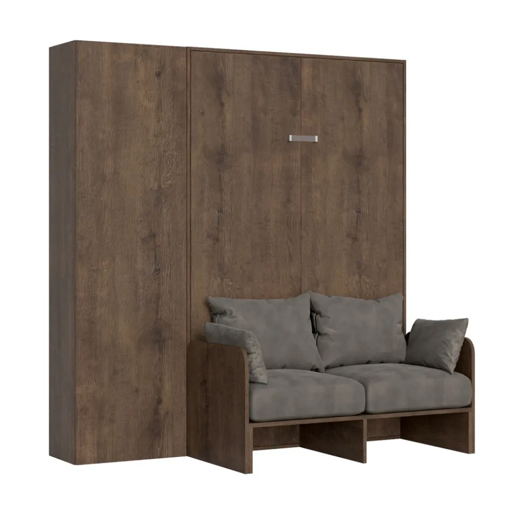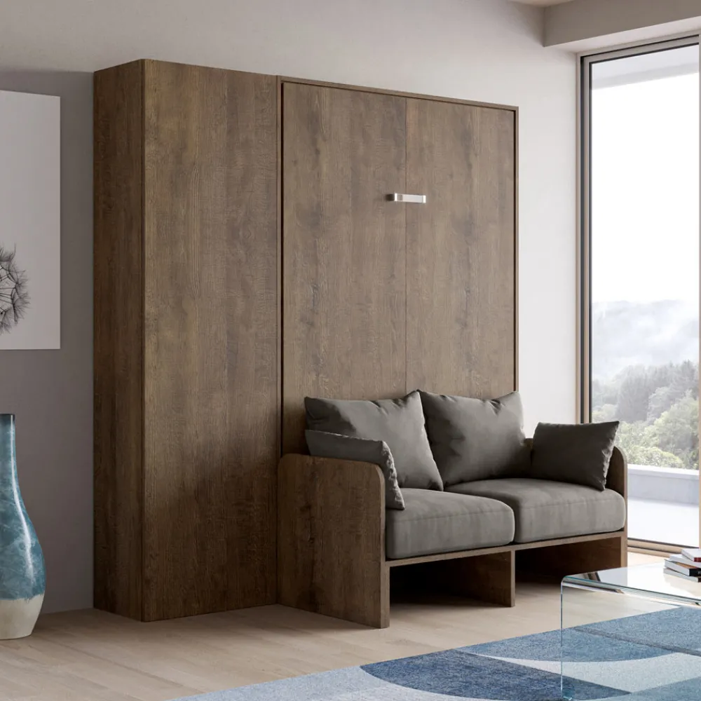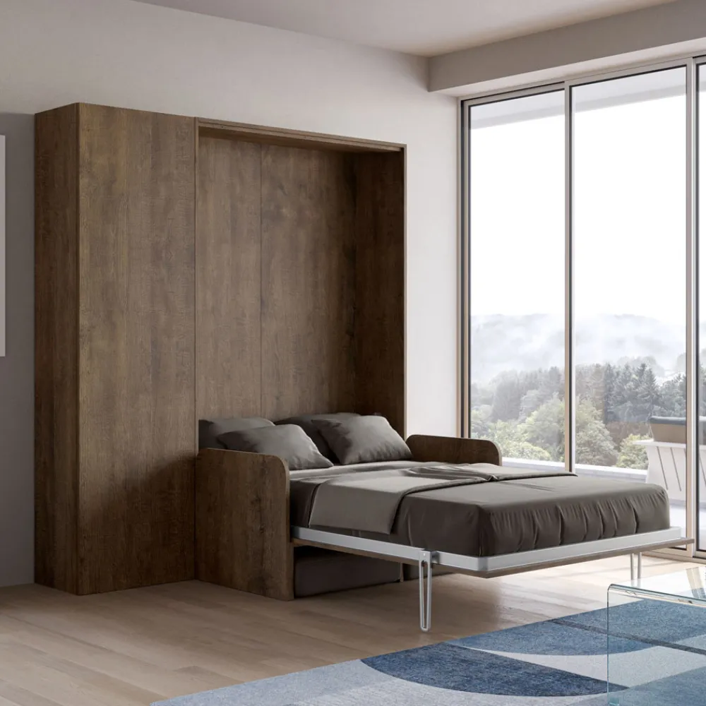 Der Bettrahmen besteht aus 18 mm dicken Melamin-Spanplatten und gewährleistet so Widerstandsfähigkeit und Langlebigkeit. Der Öffnungsmechanismus ist sanft und sicher und verwandelt die Wand mit einer einfachen Geste in ein bequemes Bett.