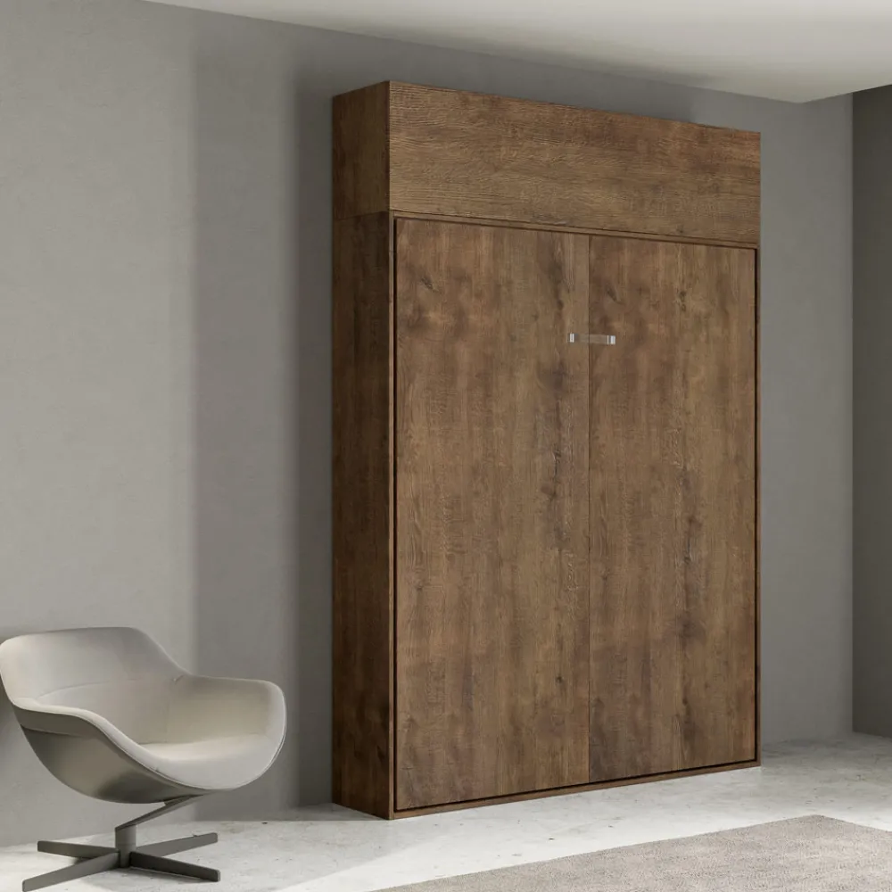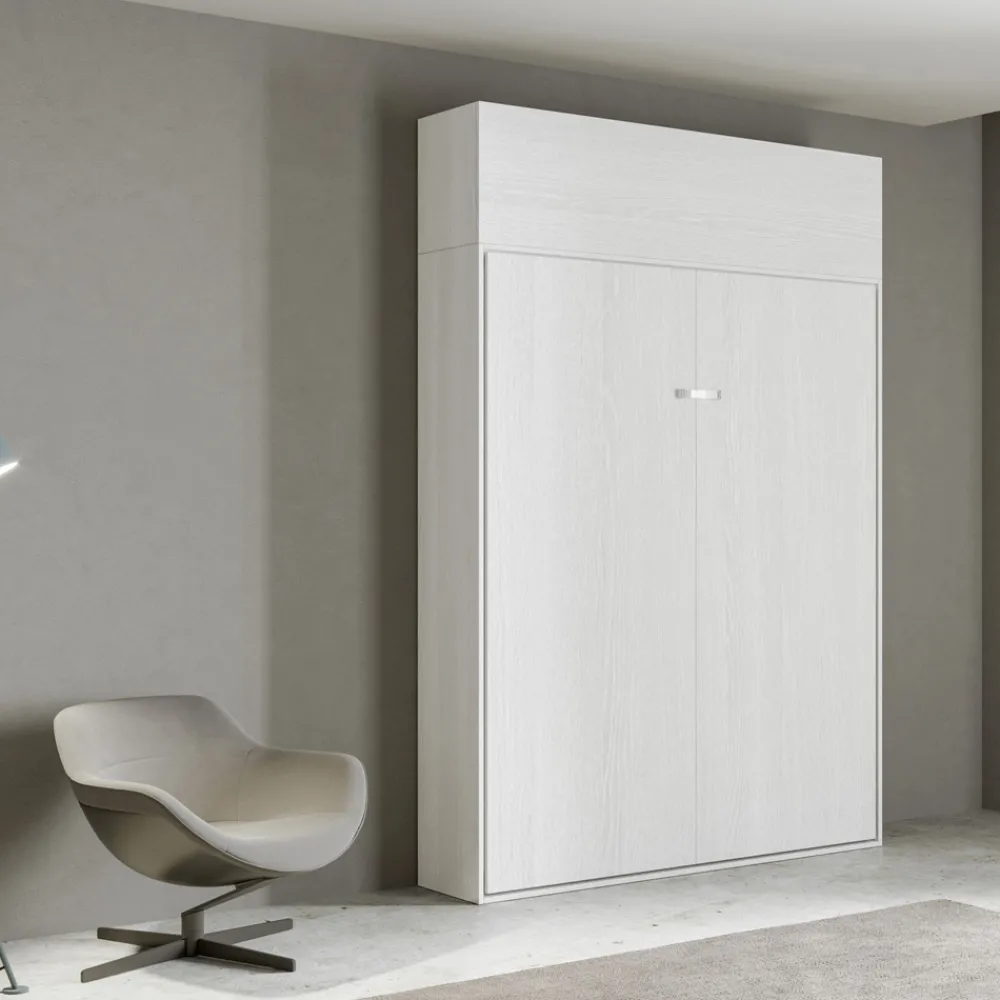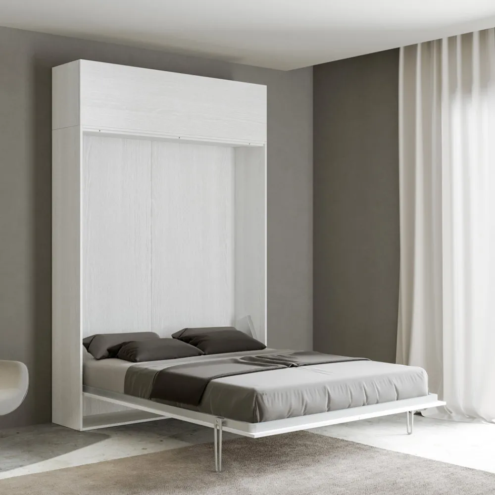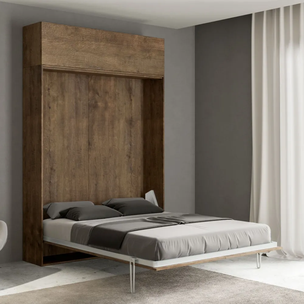 Der Bettrahmen besteht aus 18 mm dicken Melamin-Spanplatten und gewährleistet so Widerstandsfähigkeit und Langlebigkeit. Der Öffnungsmechanismus ist sanft und sicher und verwandelt die Wand mit einer einfachen Geste in ein bequemes Bett.