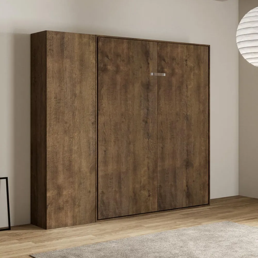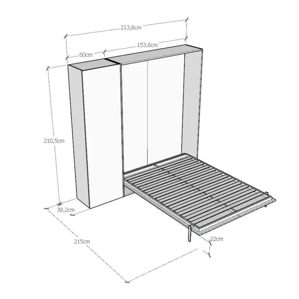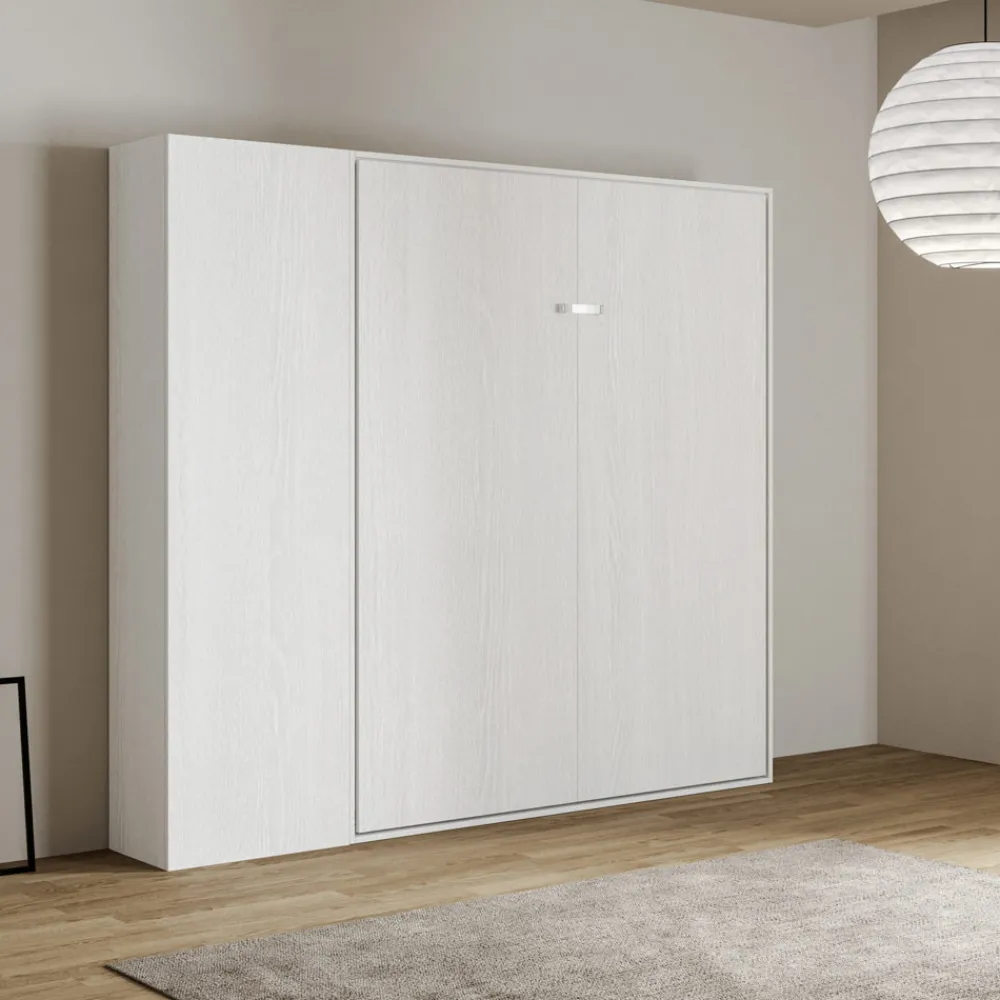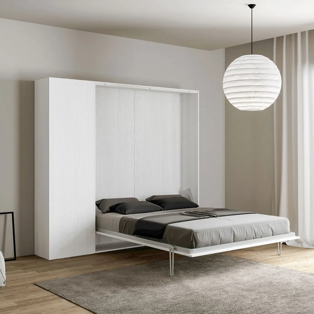 Der Bettrahmen besteht aus 18 mm dicken Melamin-Spanplatten und gewährleistet so Widerstandsfähigkeit und Langlebigkeit. Der Öffnungsmechanismus ist sanft und sicher und verwandelt die Wand mit einer einfachen Geste in ein bequemes Bett.
