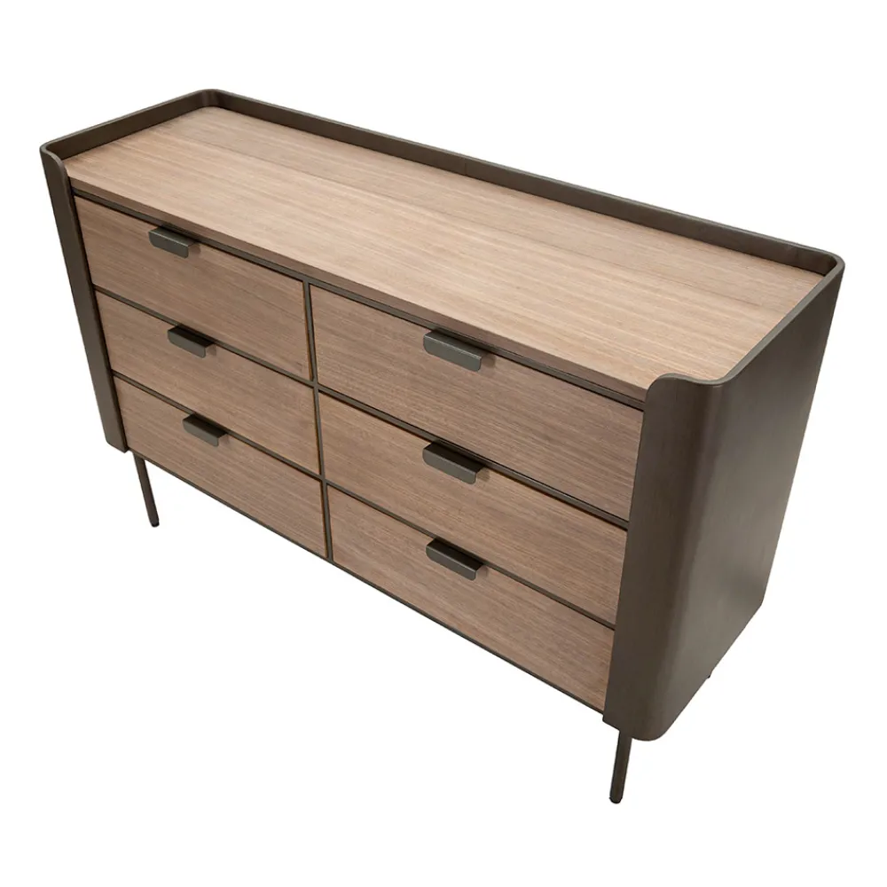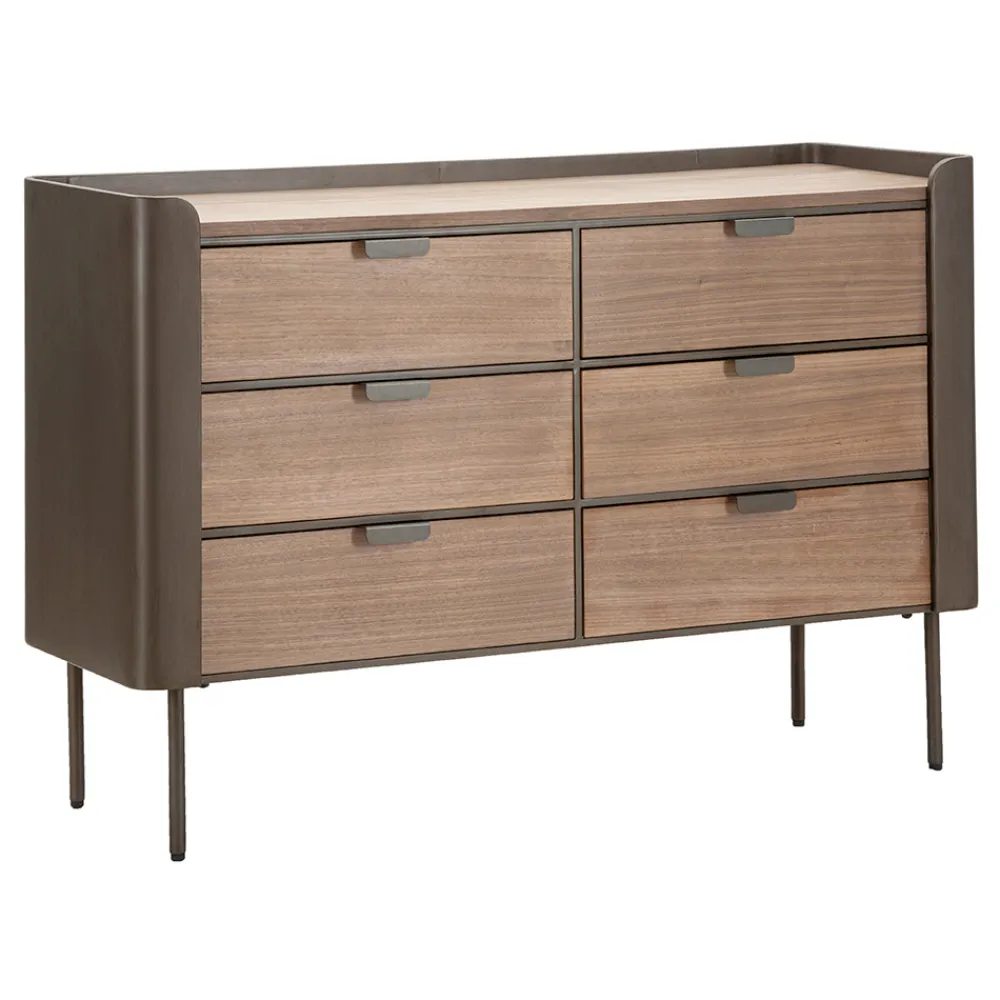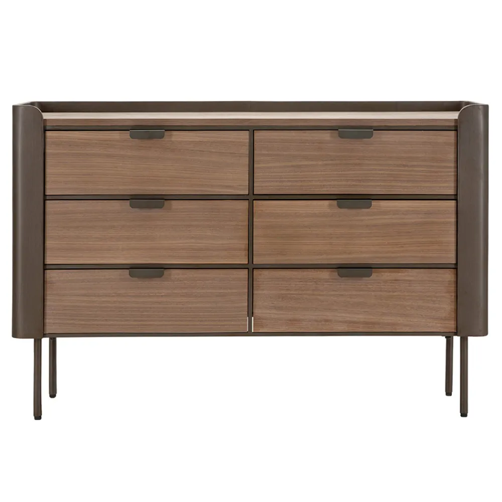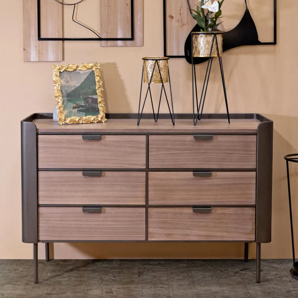 Diese Kommode aus Holz und Eisen ist die Quintessenz funktionaler Eleganz und raffinierten Designs. Mit seinen klaren Linien und seinem minimalistischen Stil passt es diskret in jede Umgebung und bietet dank seiner praktischen und leicht zu handhabenden Schubladen eine große Oberfläche und nützlichen Platz zum Aufbewahren kleiner Gegenstände. Das dunkle Holzfinish verleiht ein Gefühl von Wärme und Reichtum , während die robuste Konstruktion Haltbarkeit und Stabilität gewährleistet.