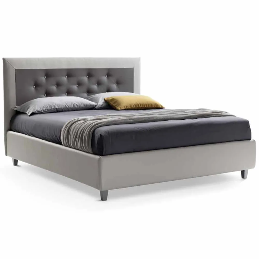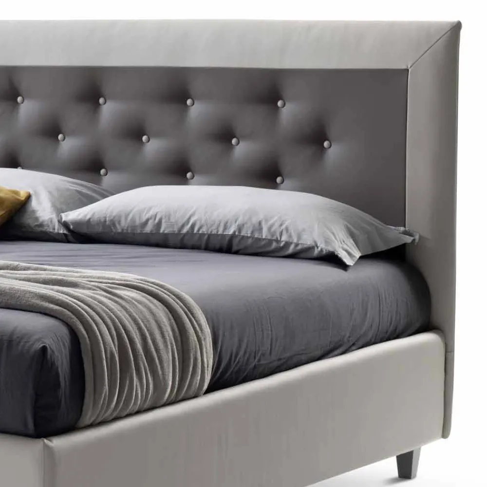 Hochwertiges Doppelbett mit Container und Kopfteil mit zweifarbigen Ökolederknöpfen, hergestellt in Italien.