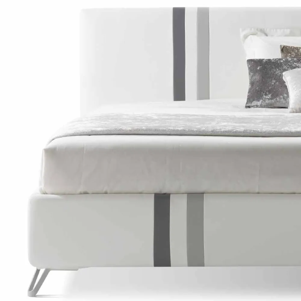 Das Kopfteil und der Bettrahmen werden von zwei vertikalen und parallelen Streifen in Madryt-Ökoleder in den Farben 990 und 982 gekreuzt. Das Kopfteil ist nicht abnehmbar, der Bettrahmen ist abnehmbar.