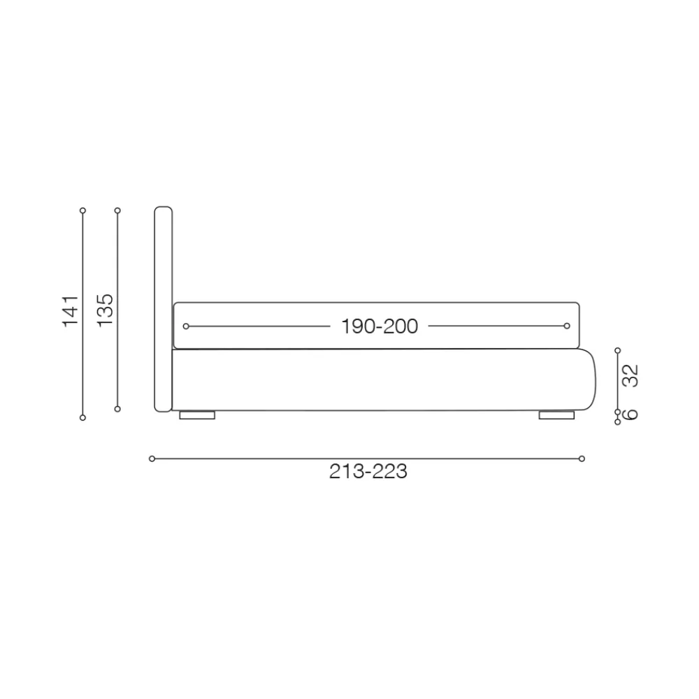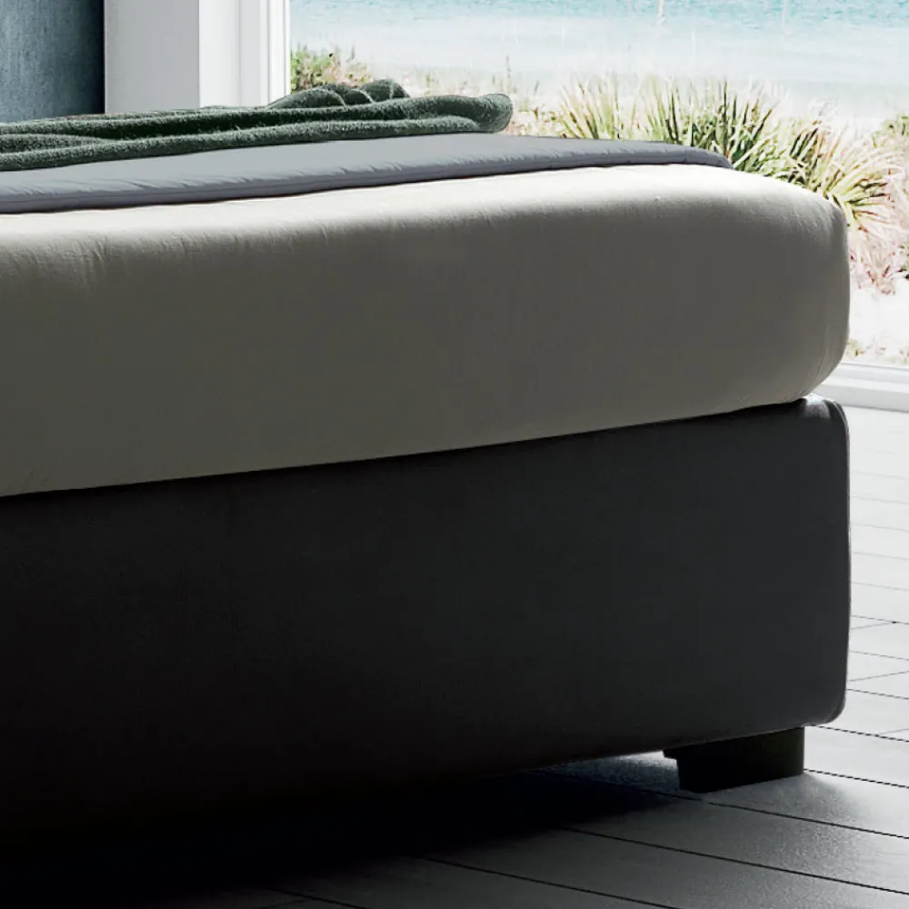Das Schlüsselelement des gesamten Designs ist das wichtige, weiche und mit Kissen gefüllte Kopfteil. Im Inneren befindet sich ein solider Rahmen aus 18 mm Spanplatten und 8 mm MDF mit einer Polsterung aus unverformbarem Polyurethan D28 und Dacron-Faser. Der 32 cm hohe Bettrahmen hat leicht abnehmbare Bezüge (Kopfteil nicht abnehmbar). Die Füße sind aus Holz und 6 cm hoch.