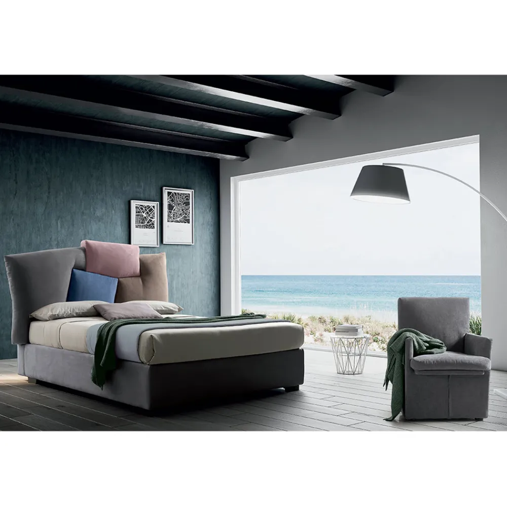 Doppelbett im Design „Made in Italy“, mit Bettkasten, mit Stoff bezogen.