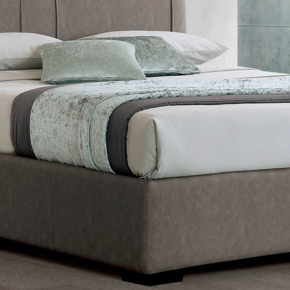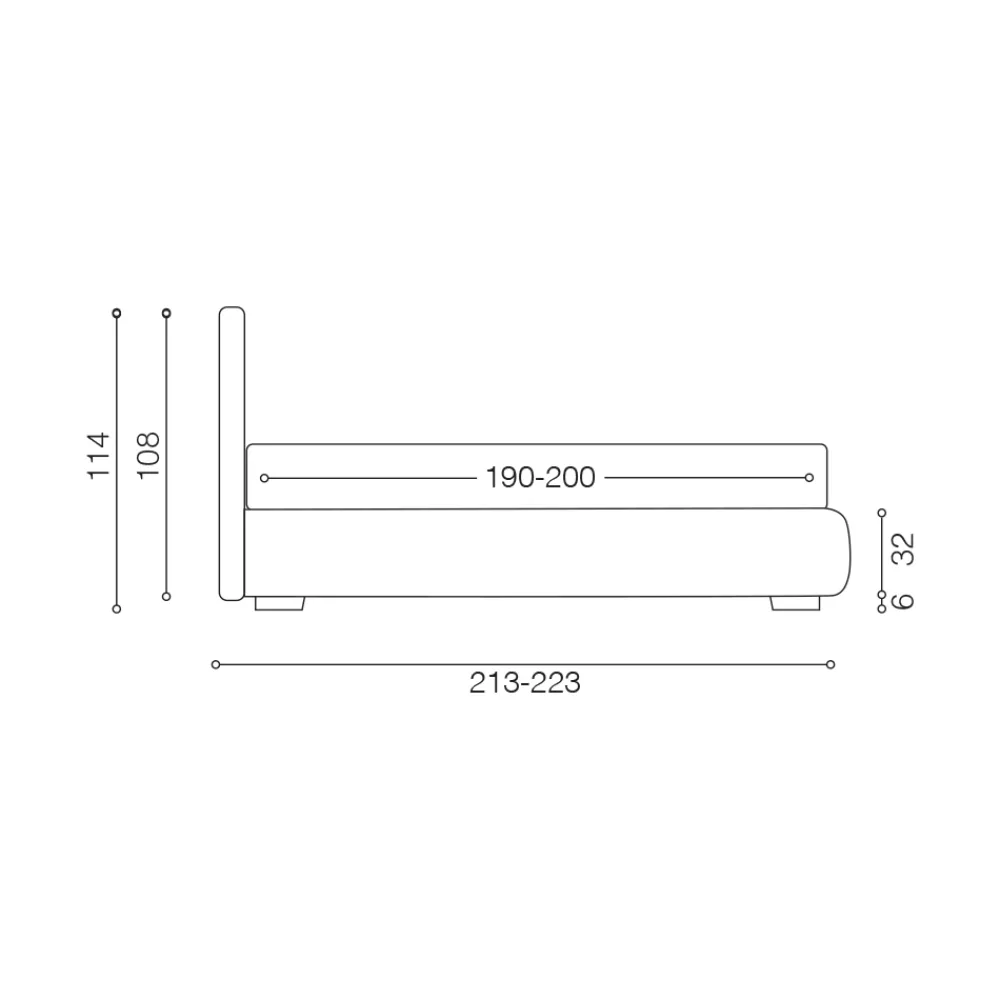 Das Kopfteil (nicht abnehmbar) hat einen Rahmen aus Pappelsperrholz und eine D28 unverformbare Polyurethanpolsterung. Der 32 cm hohe Bettrahmen kann leicht abgenommen werden. Die Füße sind aus Holz und 6 cm hoch.