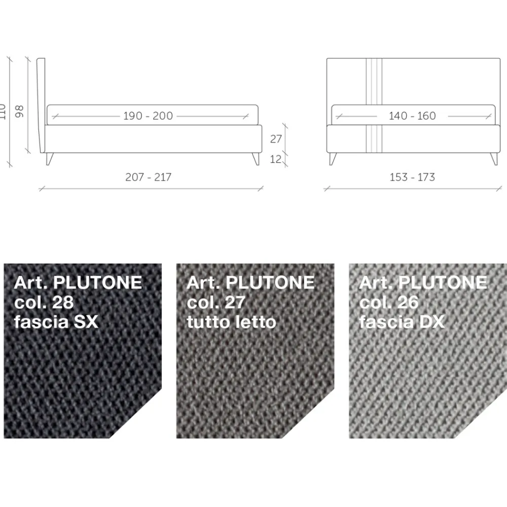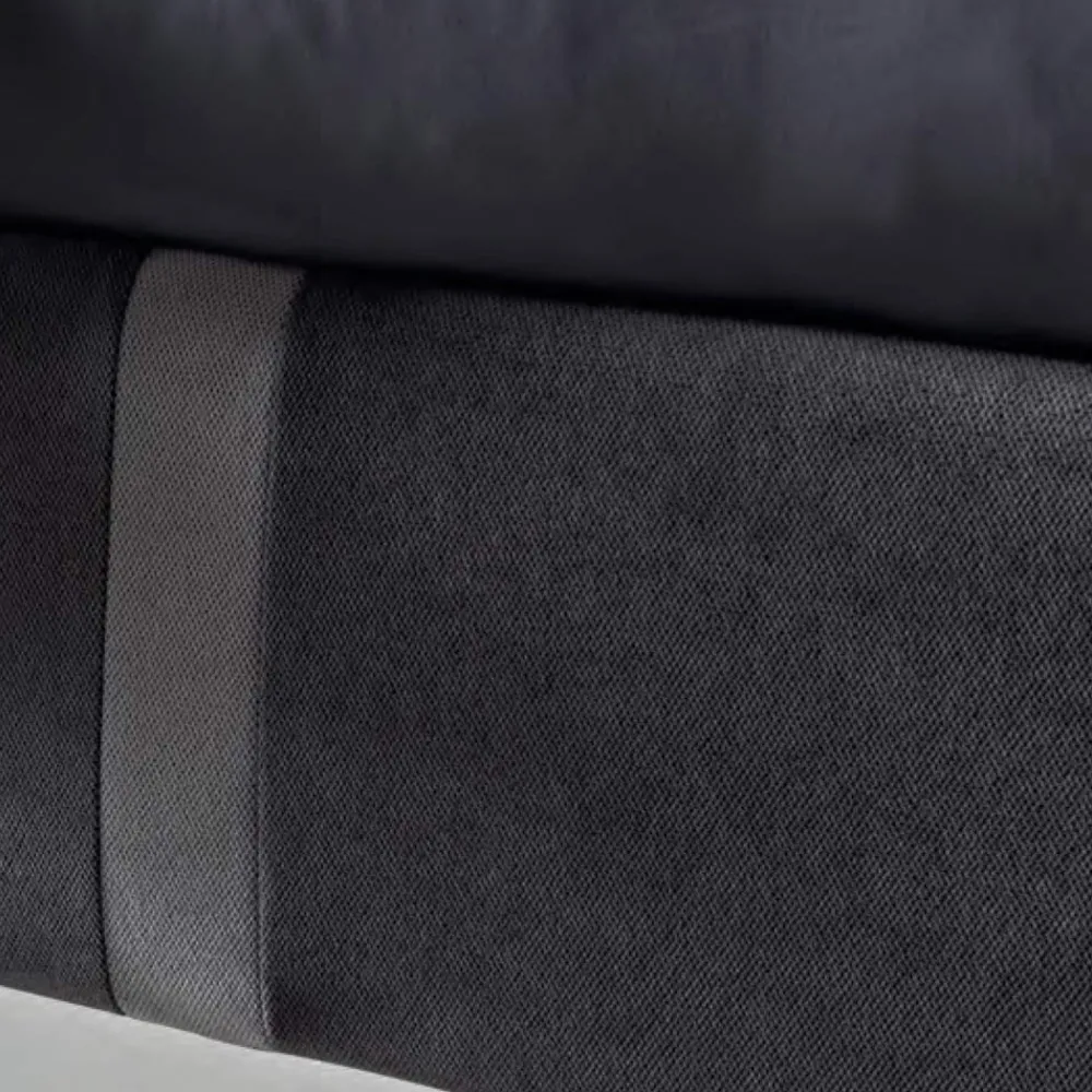 Doppelbett mit dynamischem Untergestell , Bettkasten, Metallfüßen in polierter Stahloptik (Höhe 12 cm) und Kopfteil, das sich durch die Optik mit zwei zweifarbigen vertikalen und parallelen Streifen auf Kopfteil und Bettrahmen aus wasser- und schmutzabweisendem Stoff auszeichnet.