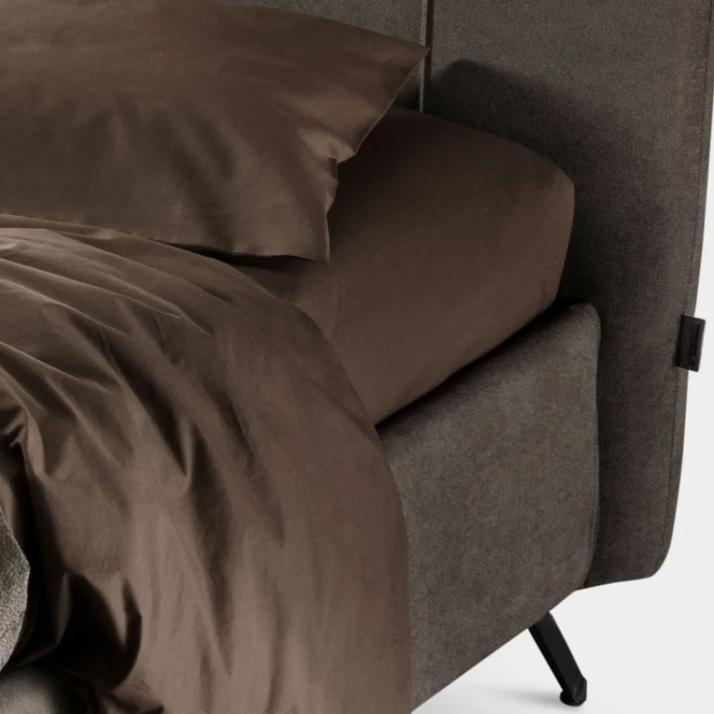 Doppelbett mit dynamischem Untergestell , Stauraumbox, Metallfüßen in polierter Stahlausführung (Höhe 12,3 cm) und Kopfteil dank einer speziellen Polsterung aus vertikalen geriffelten Profilen, die ihm einen originellen ästhetischen Effekt aus wasser- und schmutzabweisendem Stoff verleihen.