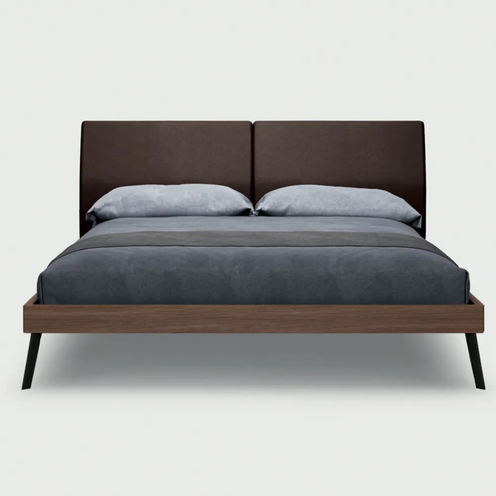 Komplettes Schlafzimmer bestehend aus 4 Elementen komplett in Italien hergestellt . Die Komposition umfasst ein Doppelbett in Terrakotta-Materialausführung mit brünierten Metallfüßen und gepolstertem Kopfteil mit Kunstlederbezug, 2 Nachttischen mit je 2 Schubladen und einer hohen Kommode mit 6 Schubladen aus Holz, die zum Bettrahmen passen. Symmetrie und Nüchternheit sind die Hauptmerkmale dieser modernen Idee, die ein romantisches Möbelkonzept zum Leben erweckt, das von wunderbaren Holzmaserungen unterstrichen und umhüllt wird, die die Ästhetik des Raumes mit Persönlichkeit bereichern. Die das Bett umgebenden Elemente begleiten das Schlafzimmer mit Einfachheit und Leichtigkeit dank ihrer geschwungenen Linien , die eine ruhige und einladende Atmosphäre schaffen, die ideal für private Wohnräume ist.