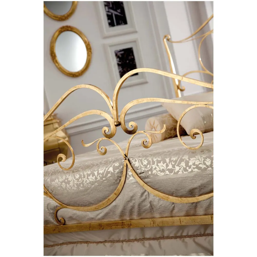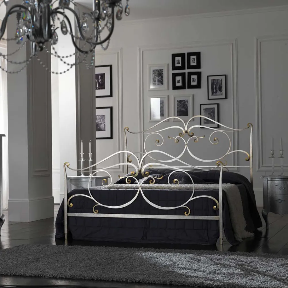 Doppelbett mit passendem Kopf- und Fußteil aus massivem Eisen , mit Pulverbeschichtung oder handgemachter Blättermalerei versehen.