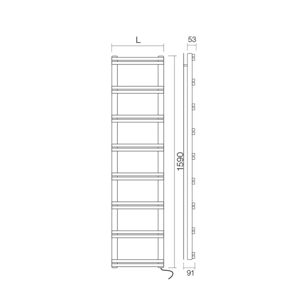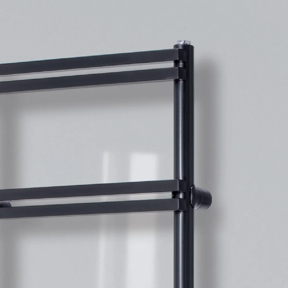 Elektrischer Handtuchwärmer aus tiefschwarzem Kohlenstoffstahl mit horizontalen Elementen und vertikalen Kollektoren, vollständig in Italien hergestellt , inklusive Wandbefestigungsset . Elektrifizierungssatz unten rechts positioniert.