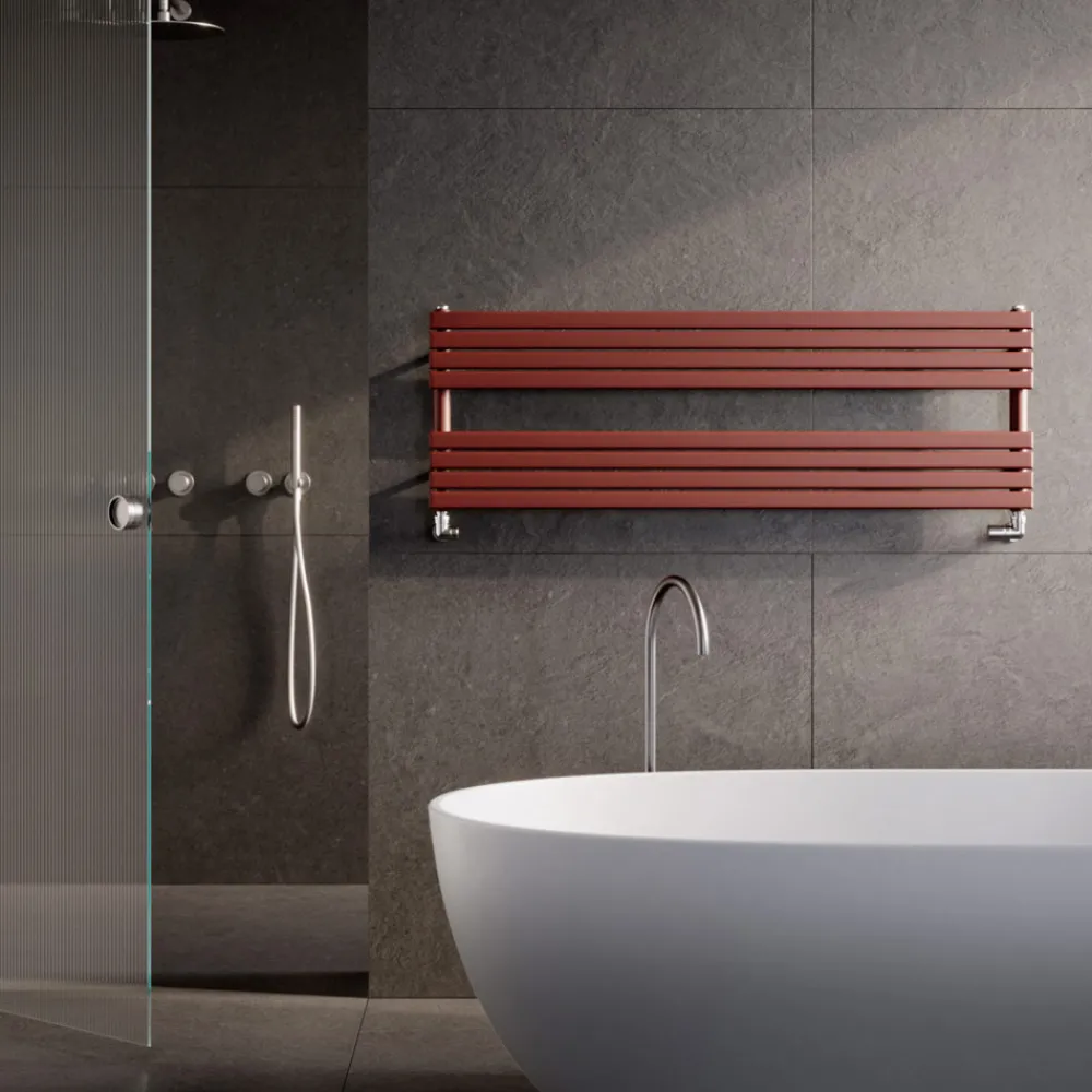Der Handtuchwärmer stellt nicht nur ein funktionales Element dar, sondern auch einen Hauch von Stil und Design . Dieses besondere Modell mit seinen klaren Linien und der Lackierung in kräftigem Rot setzt einen lebendigen Akzent .