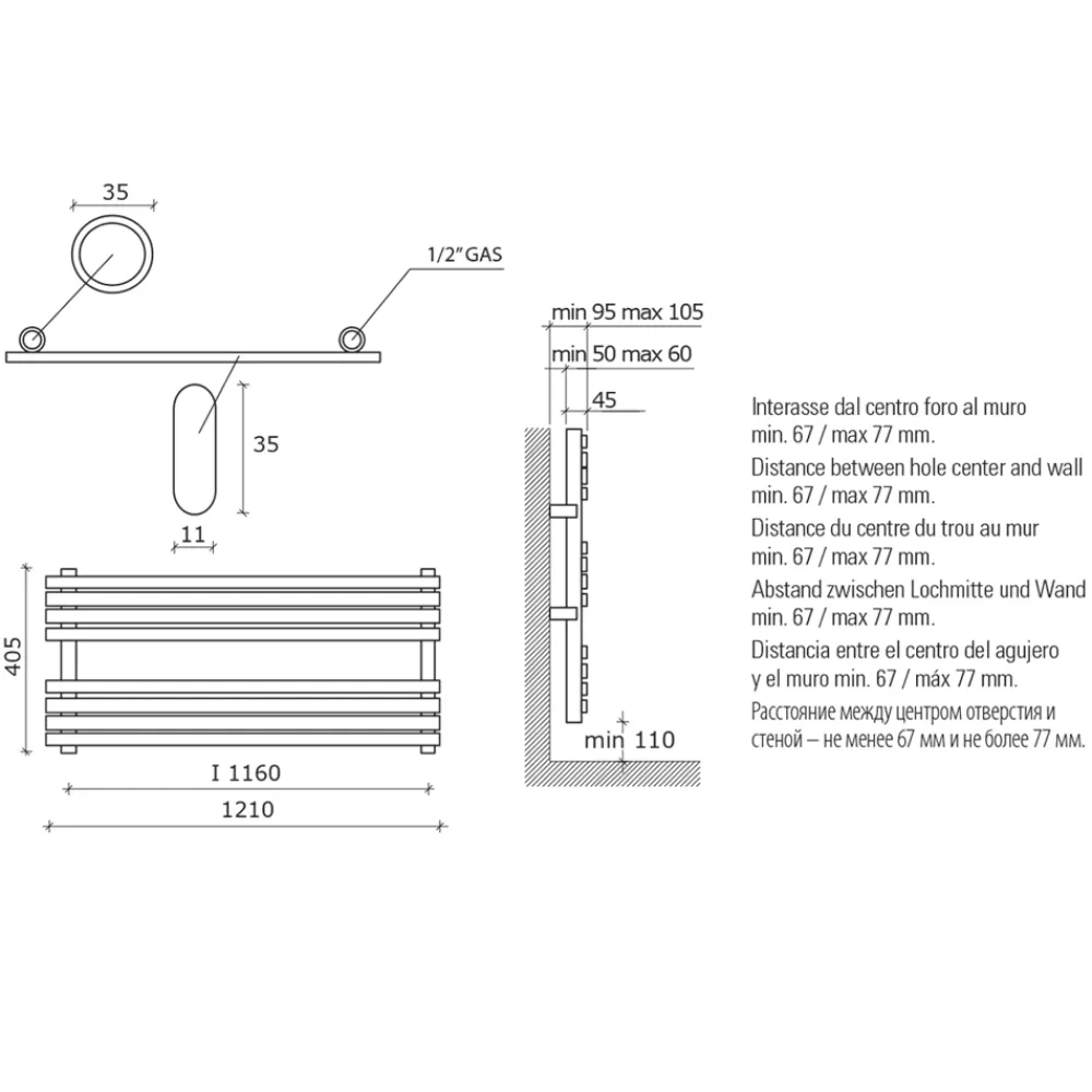 Hydraulischer Handtuchwärmer aus Kohlenstoffstahl mit matter Rostoberfläche, bestehend aus waagerechten Flachrohren 35 x 11 mm und Verteilern mit 35 mm Durchmesser, komplett in Italien hergestellt.
