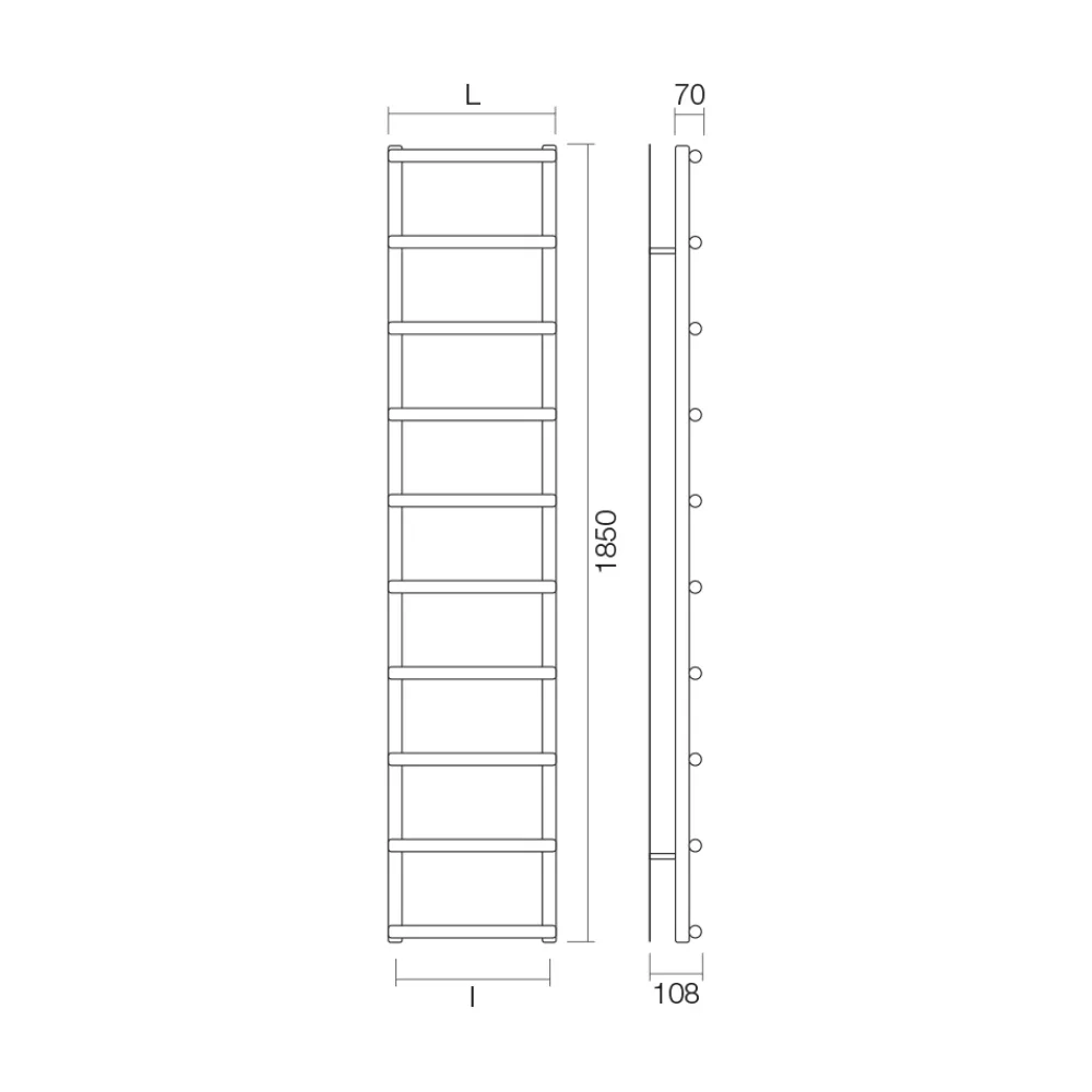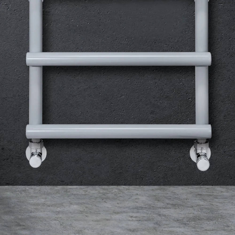 Hydraulischer Handtuchwärmer aus Kohlenstoffstahl mit hellgrauer Oberfläche , bestehend aus einer Reihe horizontaler Elemente mit einem Durchmesser von 3,5 cm, die an vertikale Verteiler mit einem Durchmesser von 3,5 cm geschweißt sind. Komplett in Italien hergestellt, inklusive Wandbefestigungsset, Entlüftungsventil und Blindstopfen .