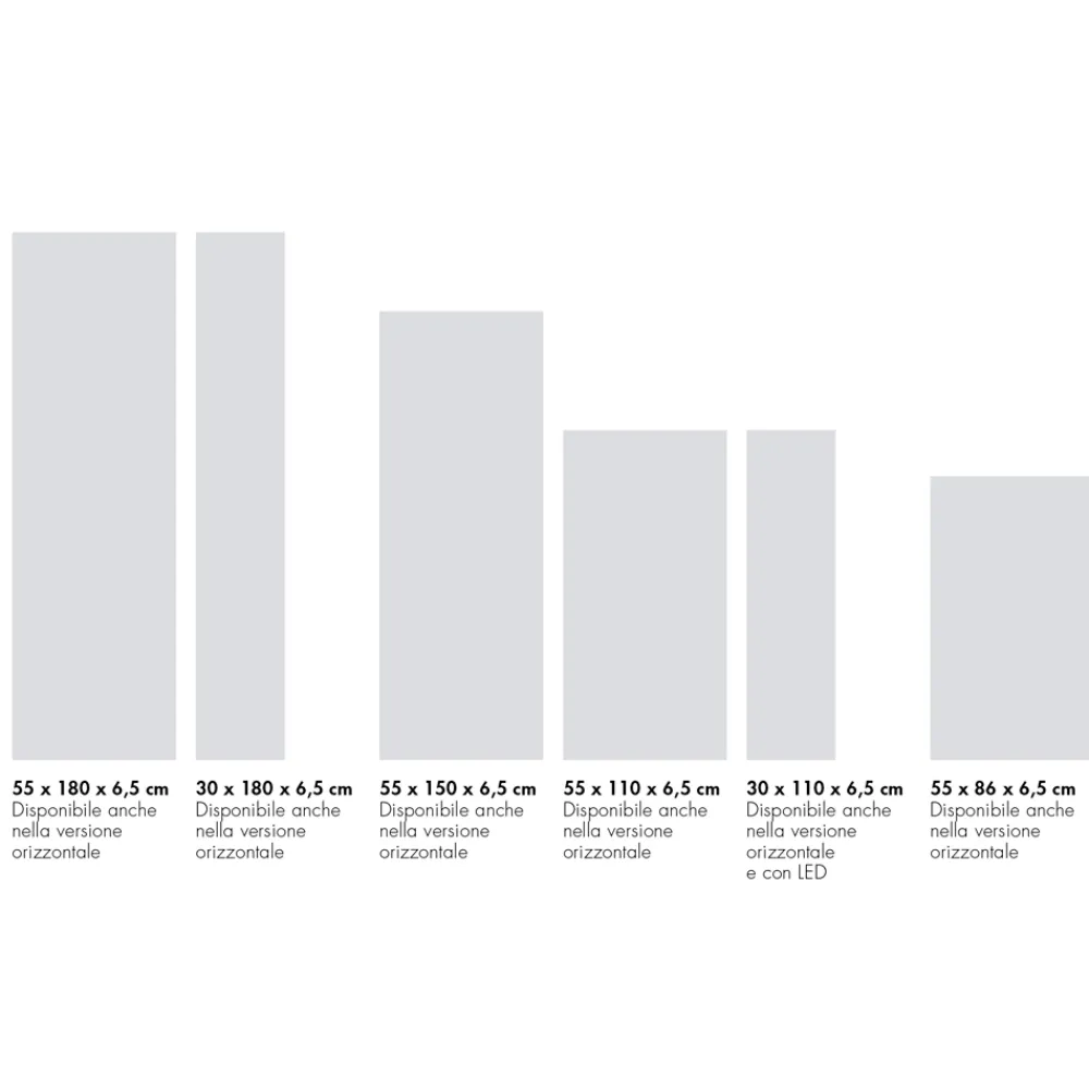 Dieses in 6 verschiedenen Größen erhältliche Möbelstück eignet sich dazu, den Stil jeder Umgebung mit Design und Funktionalität zu vervollständigen. Es garantiert hohe Widerstandsfähigkeit, einfache Montage und Flexibilität bei der Einrichtung, da es in vertikalen und horizontalen Versionen, mit 3 Technologietypen (elektrisch, hydronisch und hybrid) und einer breiten Palette verschiedener Farbkombinationen erhältlich ist.