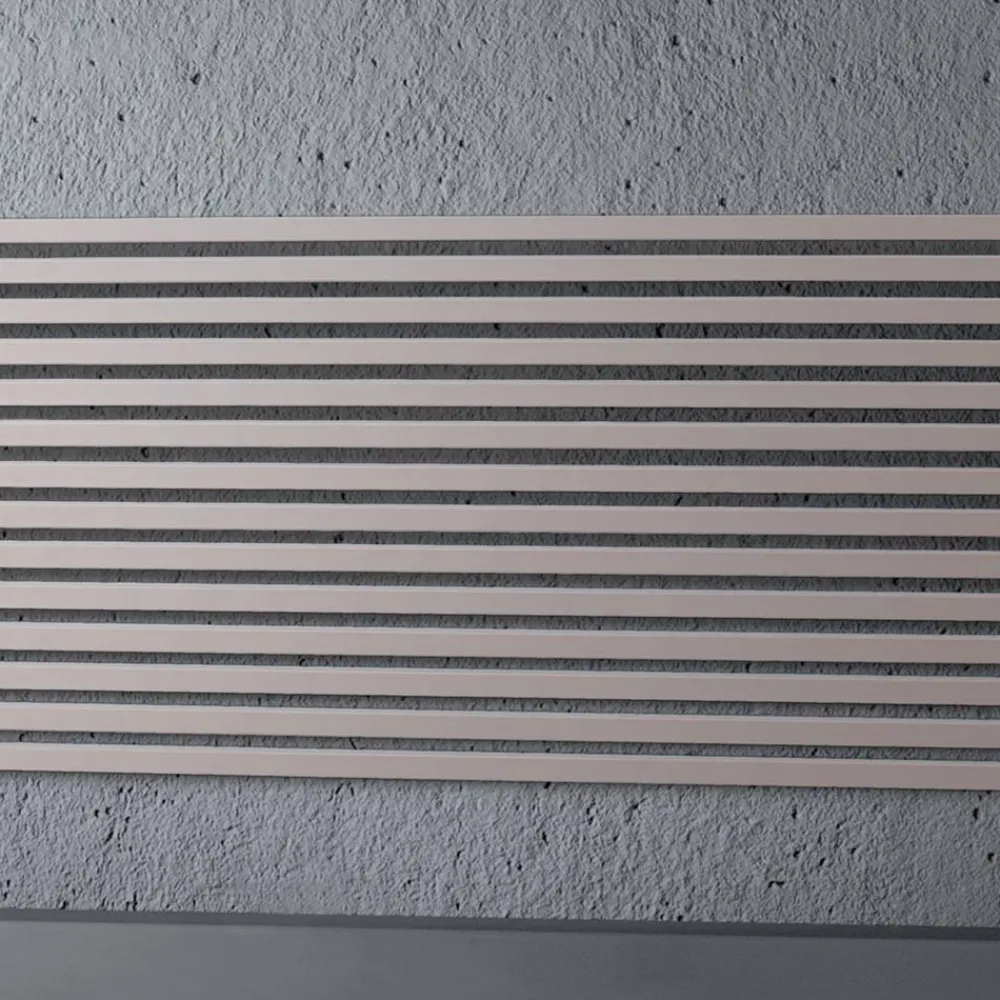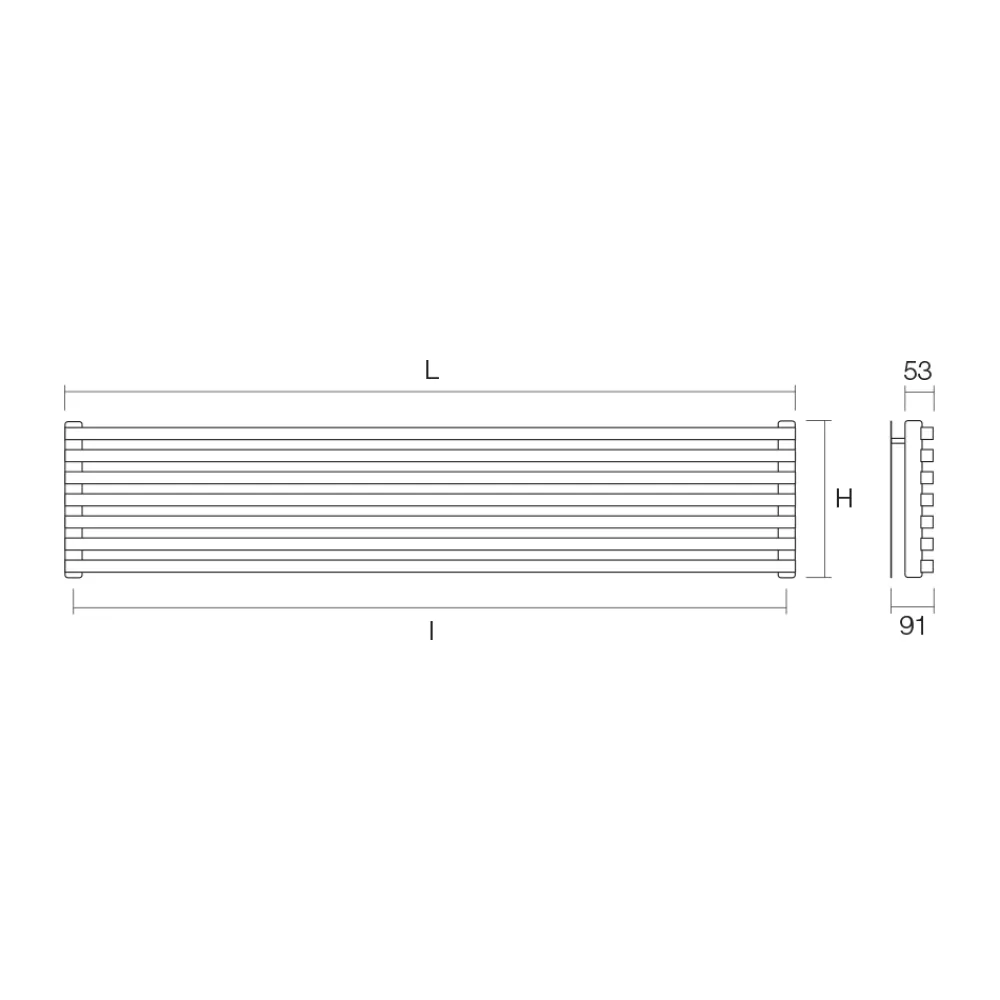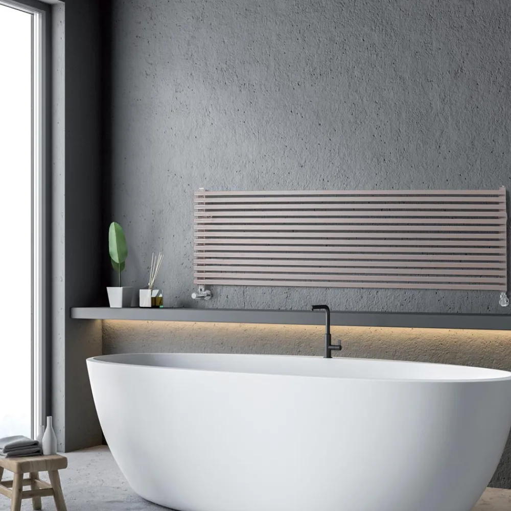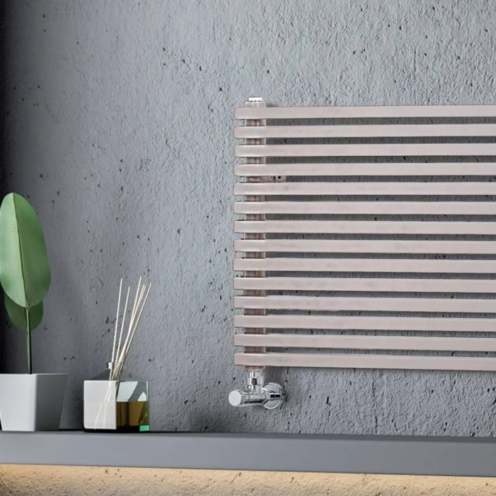 Hydraulikkühler aus Kohlenstoffstahl mit graubeiger Oberfläche, bestehend aus einer Reihe horizontaler Elemente mit einem quadratischen Querschnitt von 2 cm, die an vertikale Verteiler mit einem Durchmesser von 3,5 cm geschweißt sind. Komplett in Italien hergestellt, inklusive Wandbefestigungsset, Entlüftungsventil und Blindstopfen .