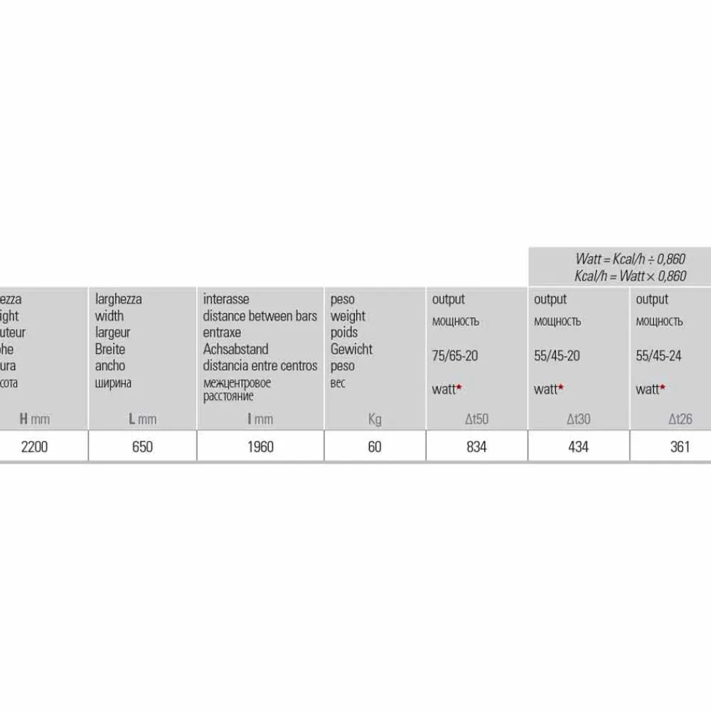 Größe: H 2200 x L 650 x Inter. 1960 mm x Leistung Δt50 834 W, Δt30 434 W, Δt26 631 W.