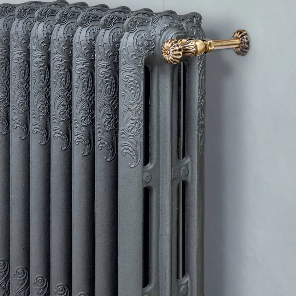 Hydraulikheizkörper aus Gusseisen mit gusseiserner grauer Oberfläche, bestehend aus 3 Säulen mit traditionellem künstlerischem Design Aus dem späten 18./frühen 20. Jahrhundert, vollständig in Italien hergestellt , inklusive Entlüftungsventil und Blindkappe .