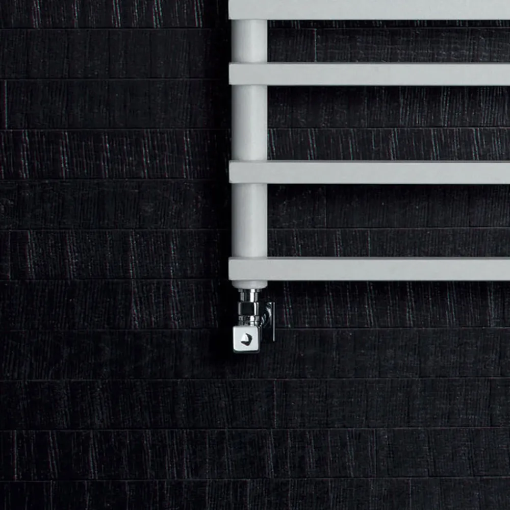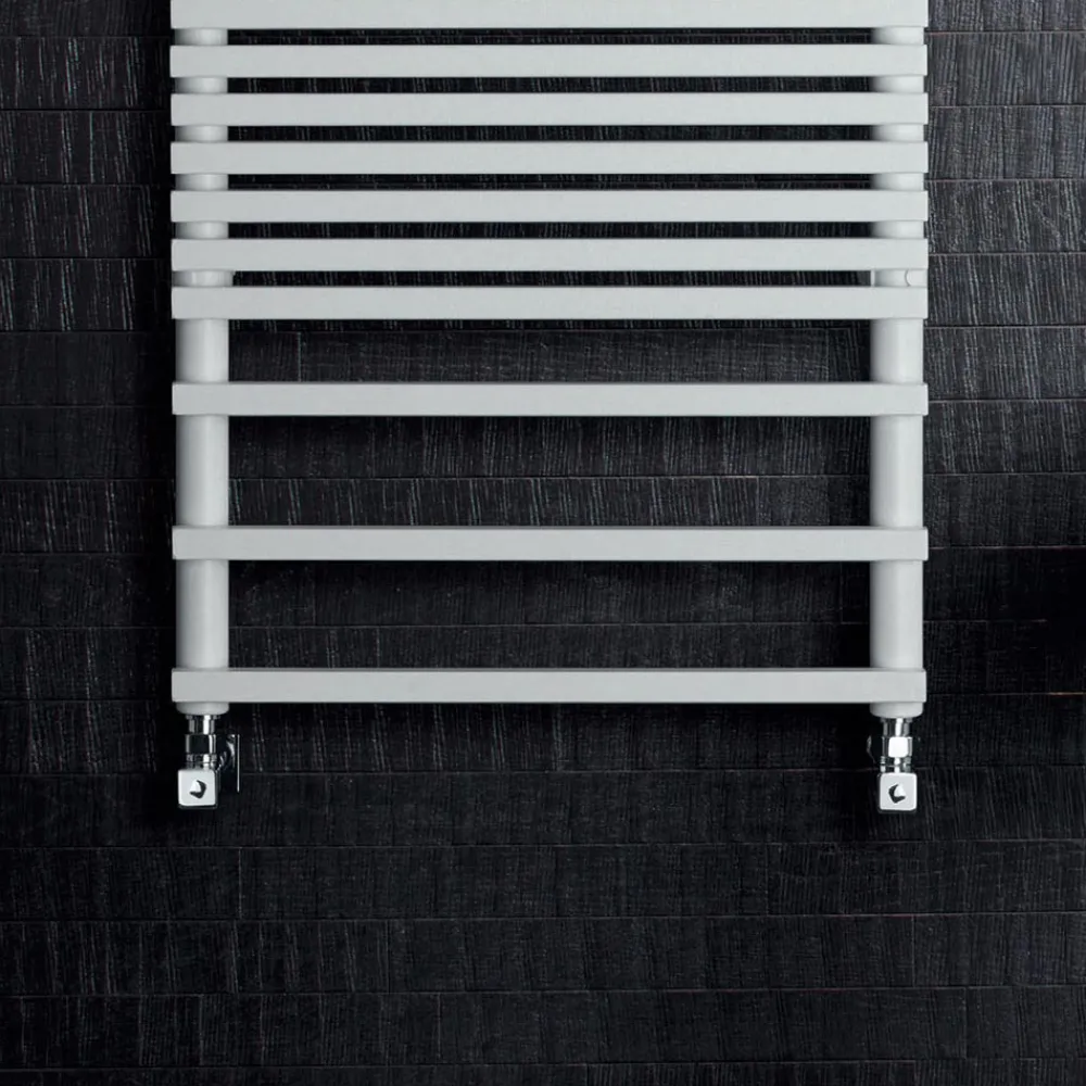 Gemischter Handtuchwärmer aus Kohlenstoffstahl mit BIGS-Finish , bestehend aus einer Reihe horizontaler Elemente mit einem quadratischen Querschnitt von 2 cm, die an vertikale Verteiler mit einem Durchmesser von 3,5 cm geschweißt sind. Komplett in Italien hergestellt, inklusive Wandbefestigungsset, Entlüftungsventil und Blindstopfen .