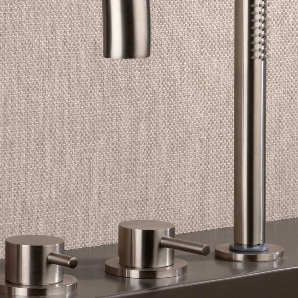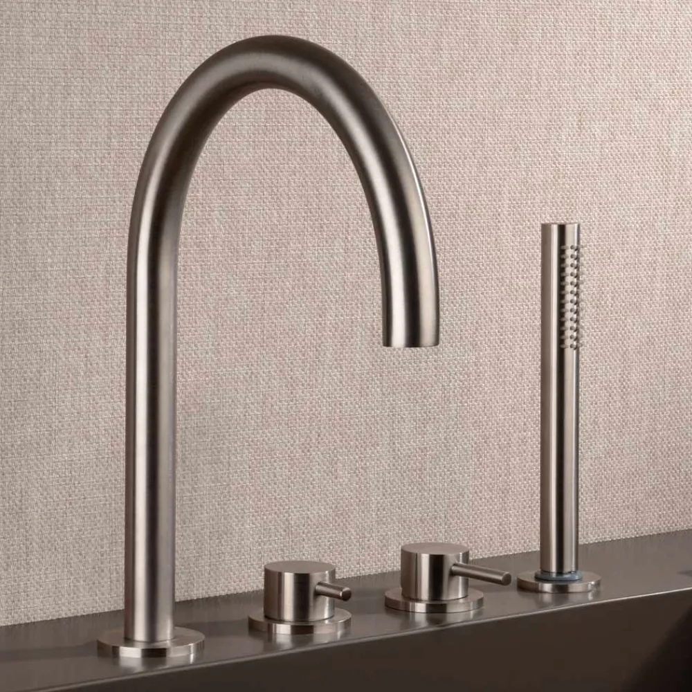 4-Loch-Wannenrandmischer mit Auslauf und 4-Loch-Brausegarnitur aus Edelstahl AISI 316L , 100 % recycelbares Material, vollständig in Italien hergestellt.