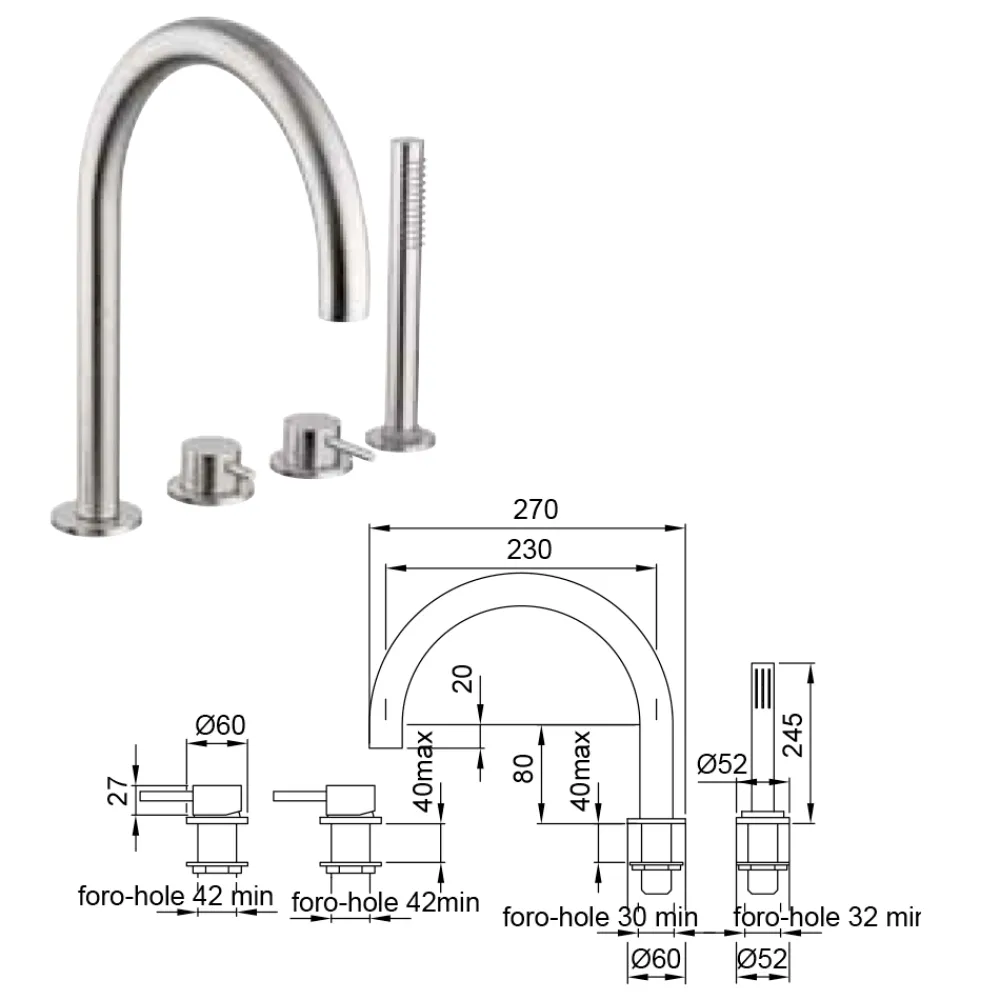 4-Loch Wannenmischer, mit Auslauf und 4-Loch Brausegarnitur Made in Italy