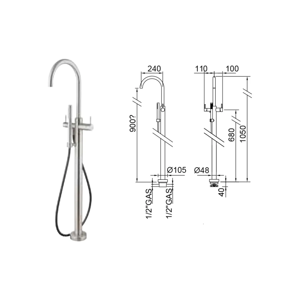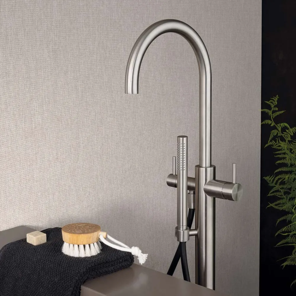 Bodenstehender externer Wannenmischer mit hohem Auslauf, separaten Öffnungs-/Schließbedienelementen und Duschset aus Edelstahl AISI 316L , 100 % recycelbares Material, vollständig in Italien hergestellt.