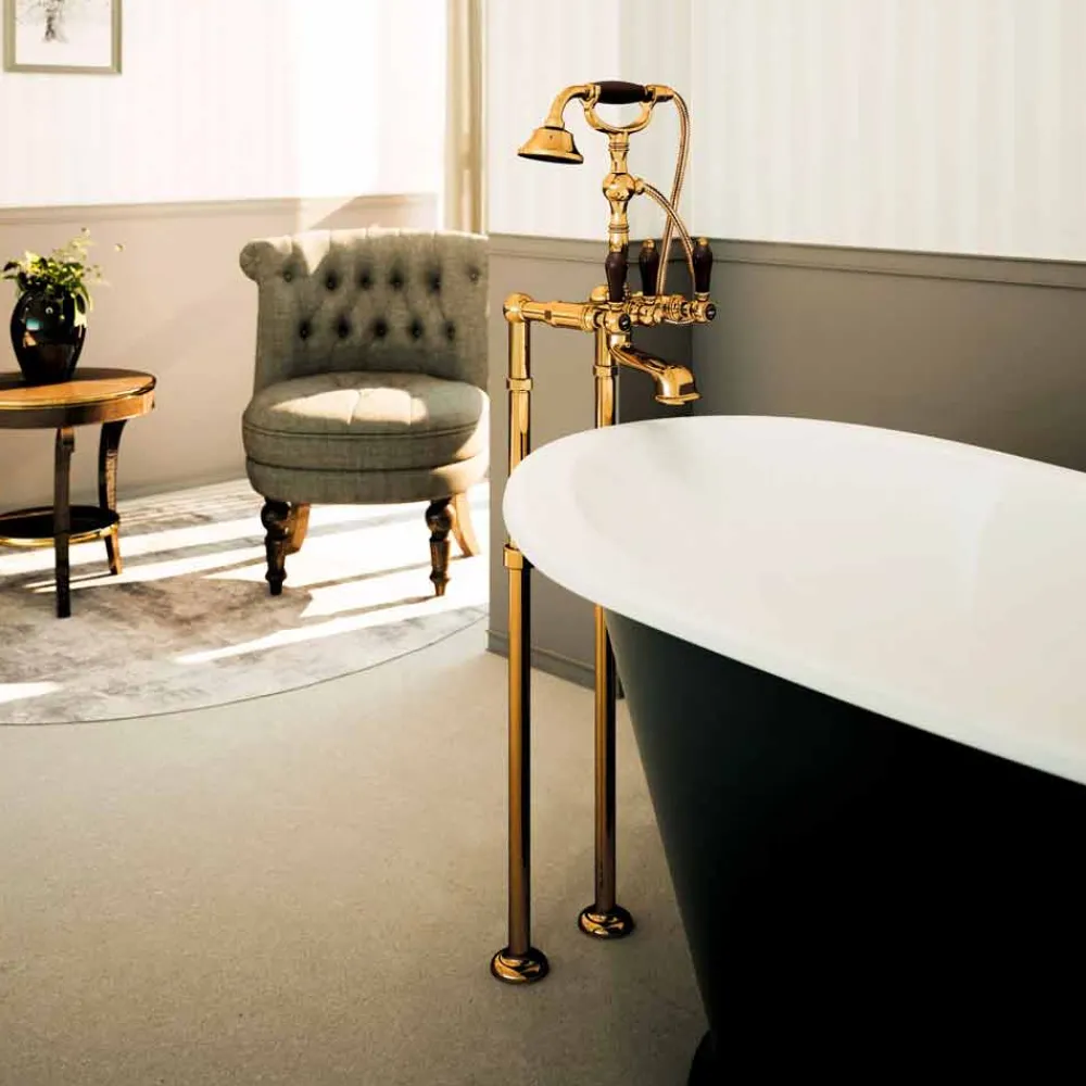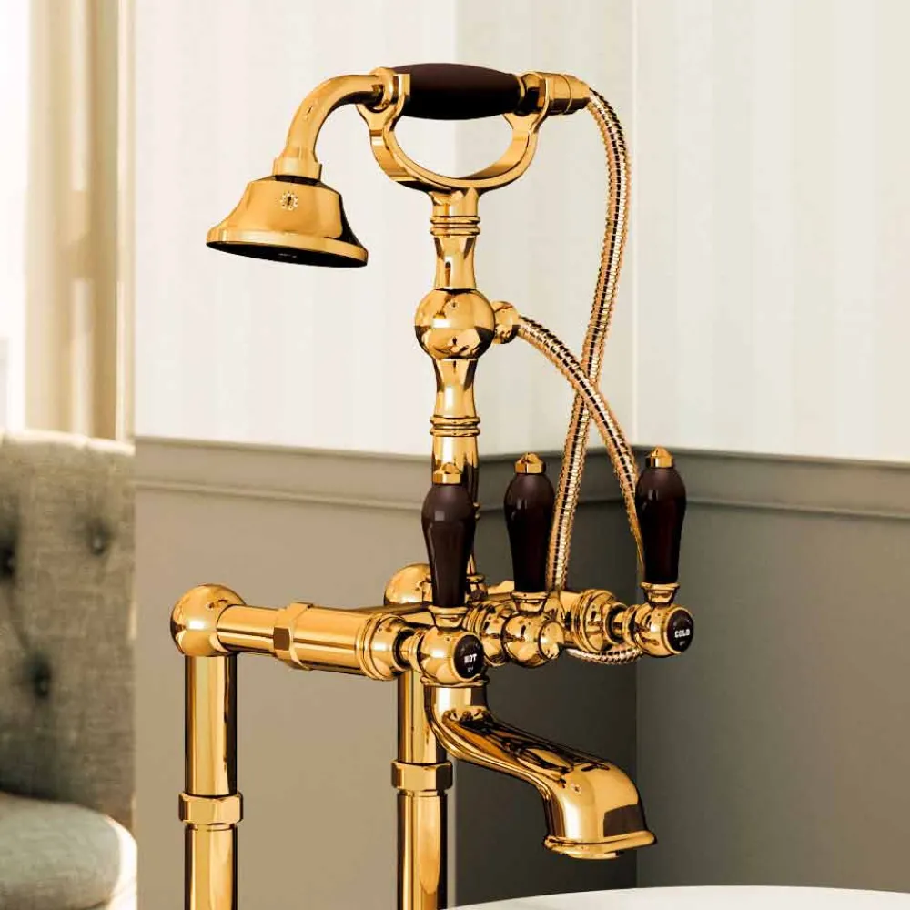 - Deluxe Gold & Brown Ceramic: poliertes 14-antikes Gold-Finish mit braunen Keramikeinsätzen an den Griffen;