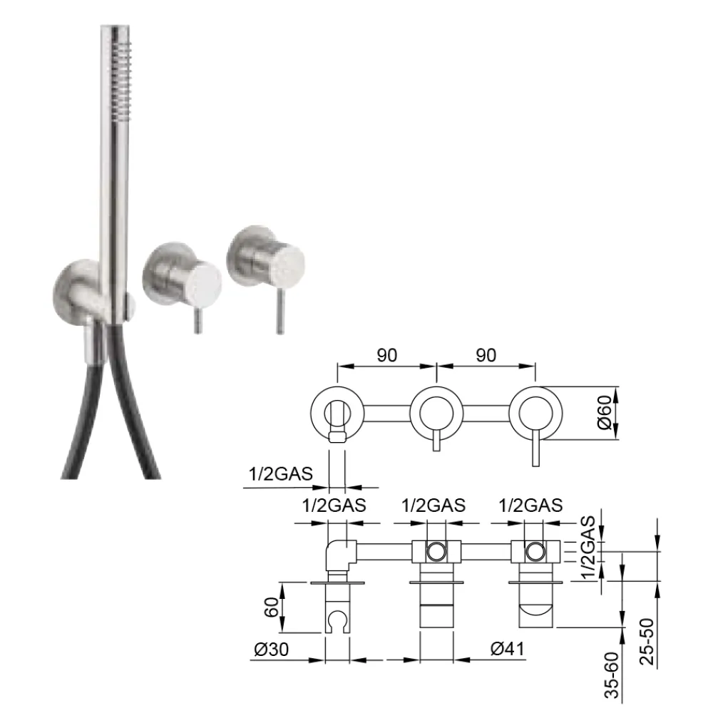 Unterputz-Brausemischer mit 3-Wege-Umstellhebel und Brausenset Made in Italy