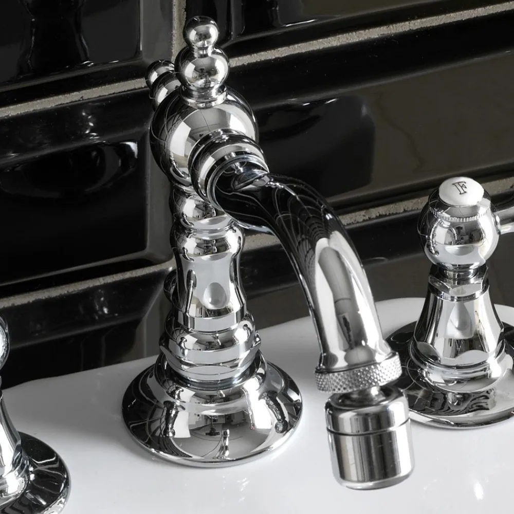 Diese raffinierte 3-Loch-Bidet-Armatur mit Abfluss ist vollständig handgefertigt von erfahrenen Handwerkern in der Industrie in schwerem Messing, gegossen in Formen, die die handwerklichen Systeme der Vergangenheit respektieren und mit einer dicken Schicht von Finish in verschiedenen Farben erhältlich geschützt.