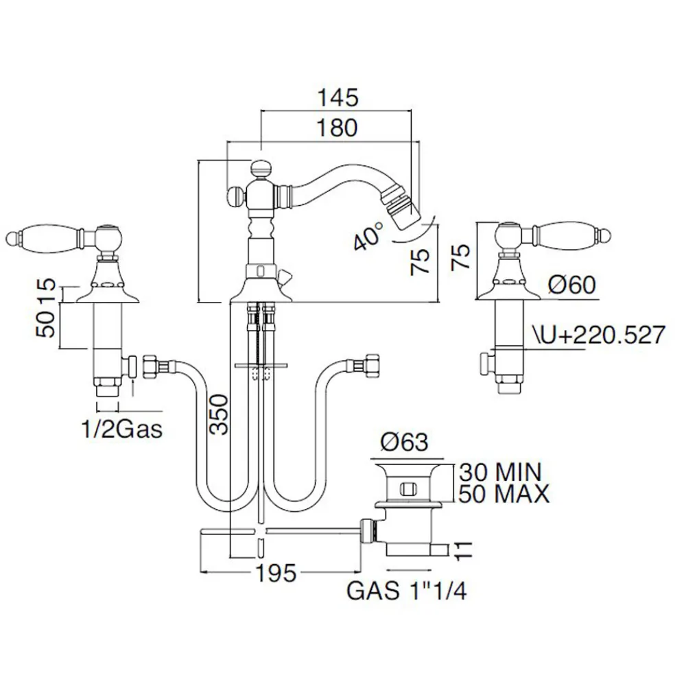 Bidet 3-Loch Wasserhahn mit Hebeln klassischen Messing-Stil, Qualität Handwerkskunst in Italien hergestellt.